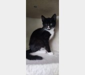 Krokiet - czarny z białym krawatem chłopczyk urodzony w lipcu 2025. Jest przepięknej urody dostojnym kocurkiem. Przeszedł koci katar, który pozbawił go widzenia w jednym oku, drugie jest zdrowe.
