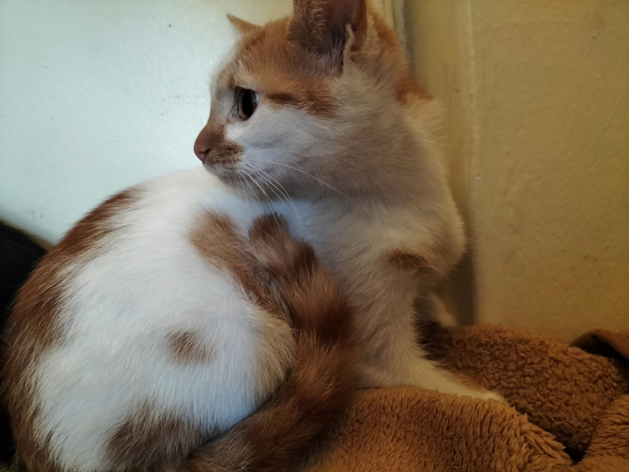 Kocurek jest nieśmiały, trochę płochliwy, boi się jeszcze dotyku człowieka, ale nie jest przy tym agresywny.