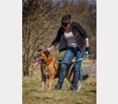 Rudy całkiem ładnie chodzi na smyczy i szybko nawiązuje kontakt z ludźmi.