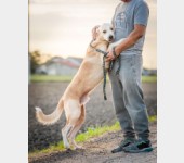 Ładnie chodzi na smyczy, jest inteligentny, wesoły, chętnie eksploruje teren ale to właśnie człowiek jest jego priorytetem. Nie ma problemu z obcymi, każdy na dwóch nogach jest od razu jego kumplem :)