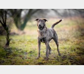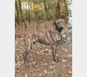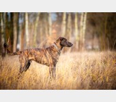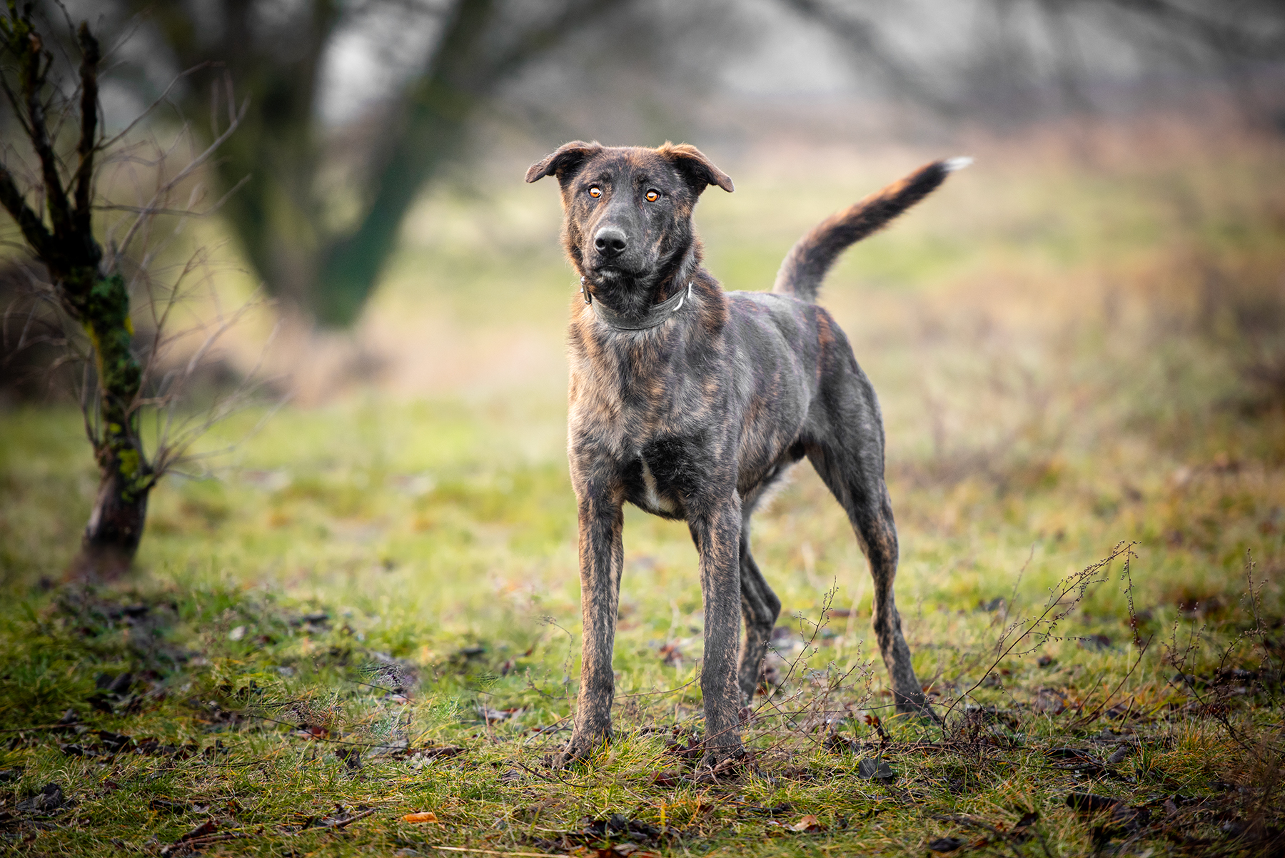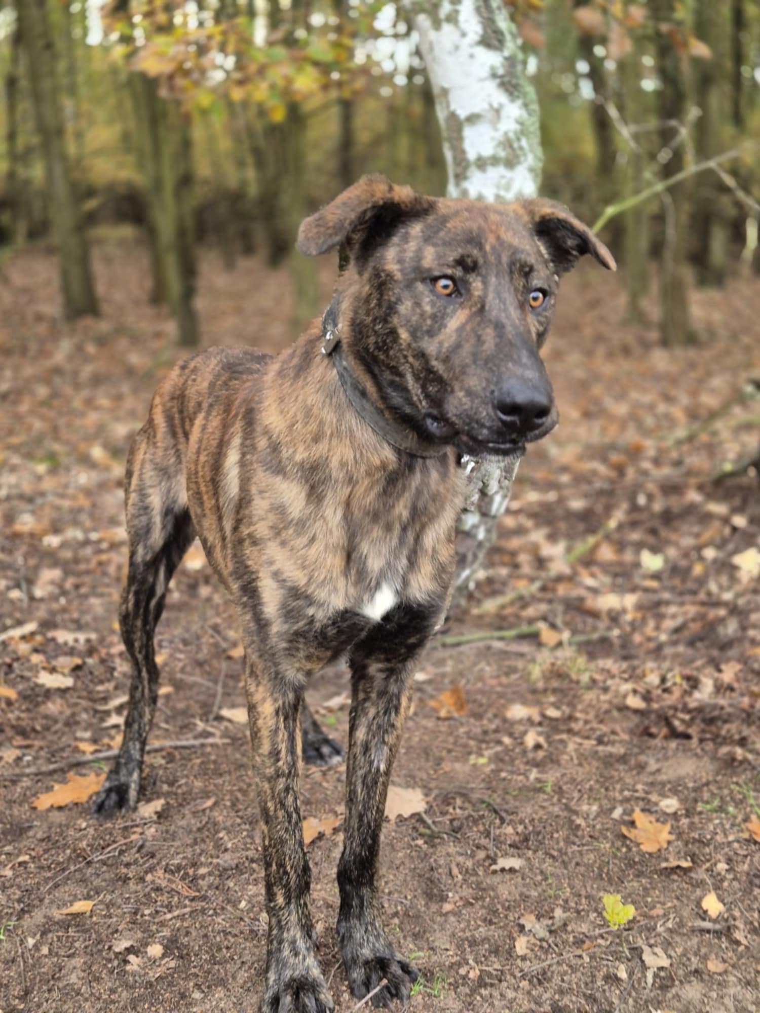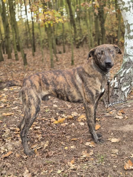 Blum to młodziutki psiak, piękny, pręgowany, prawdopodobnie ma w swoim rodowodzie jakiegoś chartopodobnego.