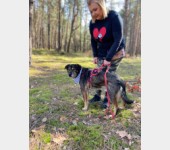 Umie chodzić na smyczy, chociaż jeszcze w pierwszej fazie spaceru ciągnie.
