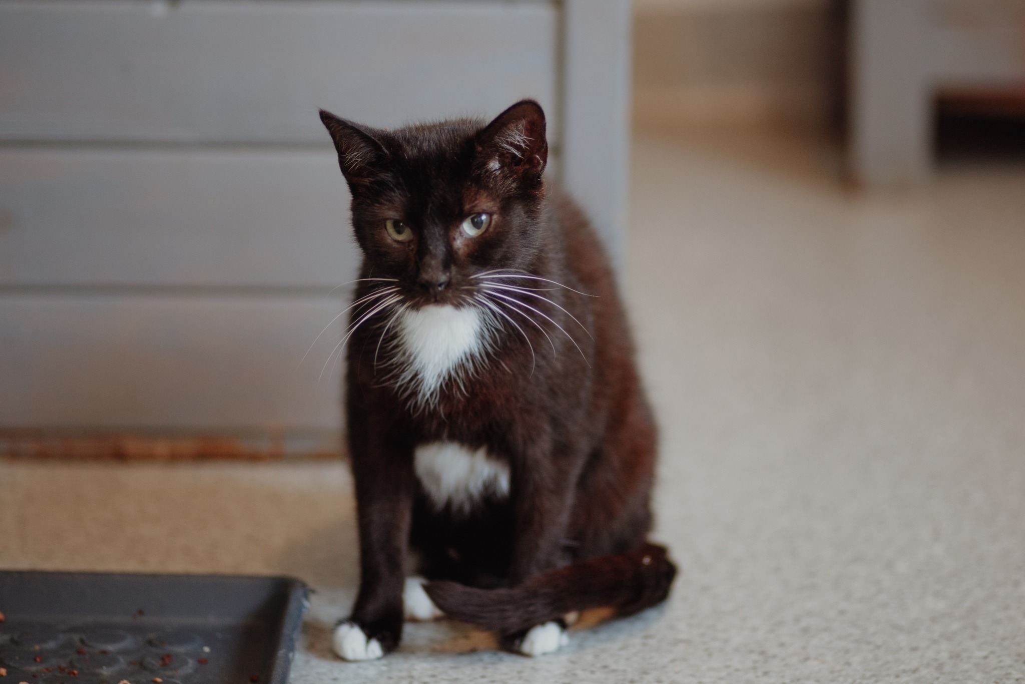 Warto wspomnieć, że gdy nasi pracownicy nakładają jedzenie dla kotów to Bryś mruczy, przybiega i przytula się! Żyje w zgodzie z innymi kotami.