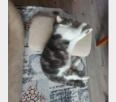 Oceniam wiek do 3 lat. Zdrowy, piękny i zadbany. Pieknie korzysta z kuwety z drewnianym żwirkiem.