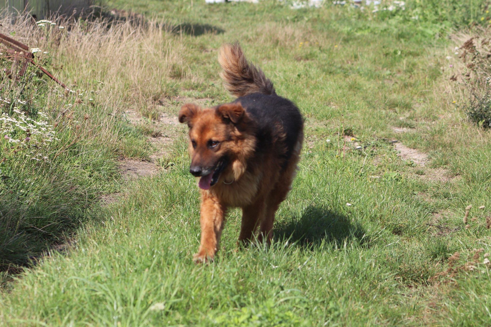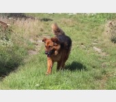Hugo. Ok. 5/6 letni piękny, dostojny pies w typie owczarka. O niespotykanej falującej, brązowo-złoto-podpalanej sierści. Wpatrzony w człowieka, toleruje też inne psy.