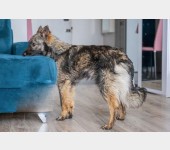 Ładnie chodzi na smyczy, choć jeszcze widać po nim sporo strachu przed porzuceniem i odgłosami dużego miasta. Do wypracowania jest wchodzenie do bloku i windy, których ewidentnie nie znał.