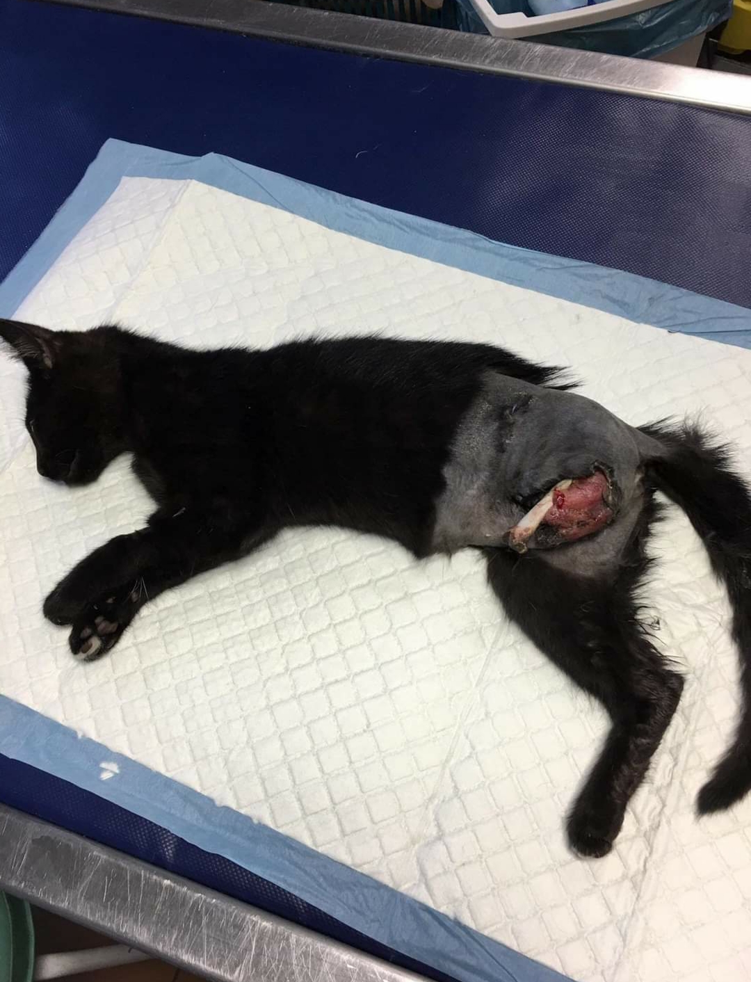 Będąc na miejscu, pan, który pracował przy remoncie schodów wspomniał, że "od kilku dni biega tu jakiś kot z wyrwaną łapą". Serce zamarło... Gdy znalazłyśmy kota zmroziło nas. Goła kość sterczała w miejscu gdzie powinna być łapa. Kot ciągnął kość po ziemi, skóra była postrzępiona, a mięśnie wychodziły na zewnątrz rany. Widok był przerażający. Jak wiele bólu musiała znieść ta kruszyna? Dlaczego nikt nie zareagował wcześniej?! Znieczulica w miejscu, gdzie ludzie powinni wykazać się jakąkolwiek empatią. Można było oszczędzić tyle cierpienia!