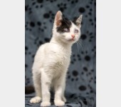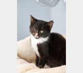 Krokiet - czarny z białym krawatem chłopczyk urodzony w lipcu 2025. Jest przepięknej urody dostojnym kocurkiem. Przeszedł koci katar, który pozbawił go widzenia w jednym oku, drugie jest zdrowe.