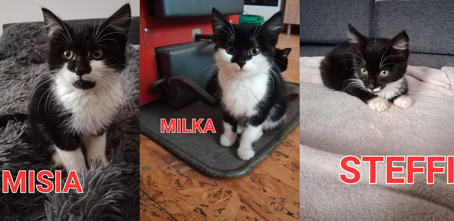 Steffi, Milka i Misia to 3 miesięczne rodzeństwo porzucone bestialsko przy ruchliwej drodze. Jedno z kociąt tragicznie zginęło pod kołami auta, na szczęście tym dziewczynkom w porę przyszła pomoc i tak o to znalazły się pod naszą opieką.