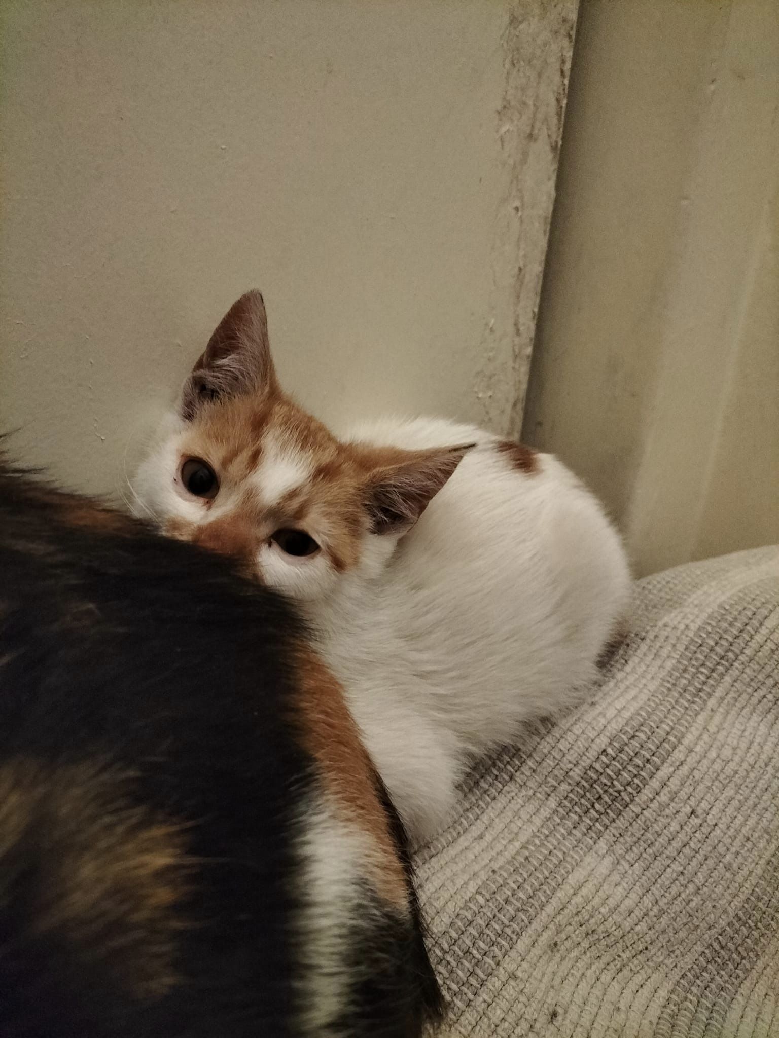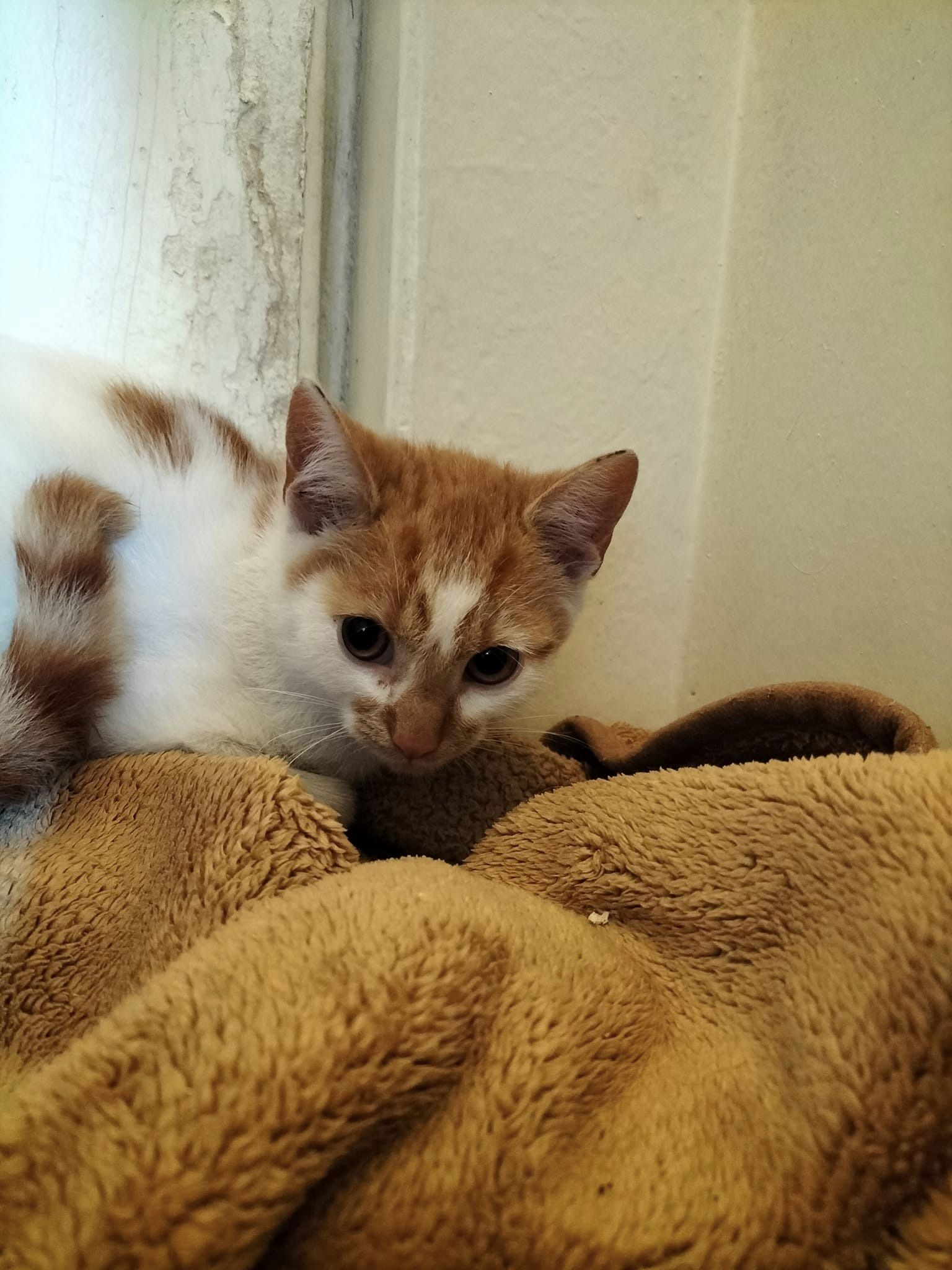 Kocurek jest nieśmiały, trochę płochliwy, boi się jeszcze dotyku człowieka, ale nie jest przy tym agresywny.