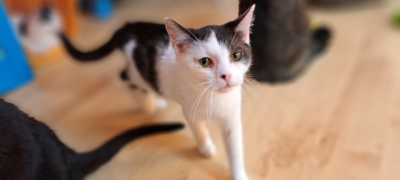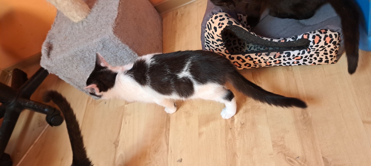 Pysio trafił do nas z mamą i rodzeństwem. Kotka nie byla absolutnie dzika, nieco wystraszona, ale dosłownie po kilku dniach nabrała zaufania do nowych opiekunów i ochoczo przybiegała pchając się na kolana głośno mrucząc. czyżby ktos pozbyl sie problemu skazując maluchy na głód, bezdomność i cierpienie? Pysio jest najmniejszy z całego rodzeństwa, ale też najszybciej otworzył swoje kocie serduszko na człowieka. Z początku był bardzo nieufny i bojaźliwy, ale z dnia na dzień zaczął robić ogromne postępy, już daje się głaskać i nawet przy tym mruczy. Kocurek jest młodziutki, ciekawski, energiczny, z początku boi się wszystkiego, ale potrzebuje czasu, żeby się oswoić. Do psów jest w stanie się przekonać, tylko potrzebuje chwili na przyzwyczajenie się. Pysio to naprawdę fantastyczny koci młodzieniec, który bardzo potrzebuje miłości i poczucia bezpieczeństwa, żeby mógł zrozumieć, że człowiek może być dobry. Z dnia na dzień widzimy jego ogromne postępy, coraz śmielej podchodzi do człowieka. Kocurek bez problemu korzysta z kuwety i umie zachować czystość. Najlepiej czuje się w towarzystwie innych kotów, więc jest idealny na dokocenie, bądź adopcje w dwupak. Absolutnie nie nadaje się na jedynaka.