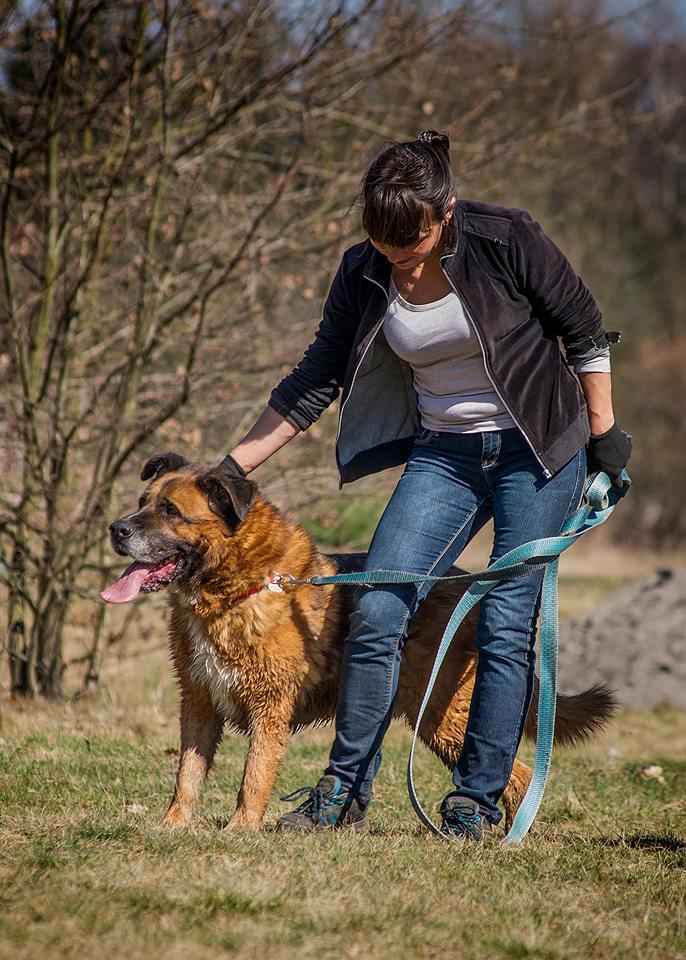 Rudy całkiem ładnie chodzi na smyczy i szybko nawiązuje kontakt z ludźmi.