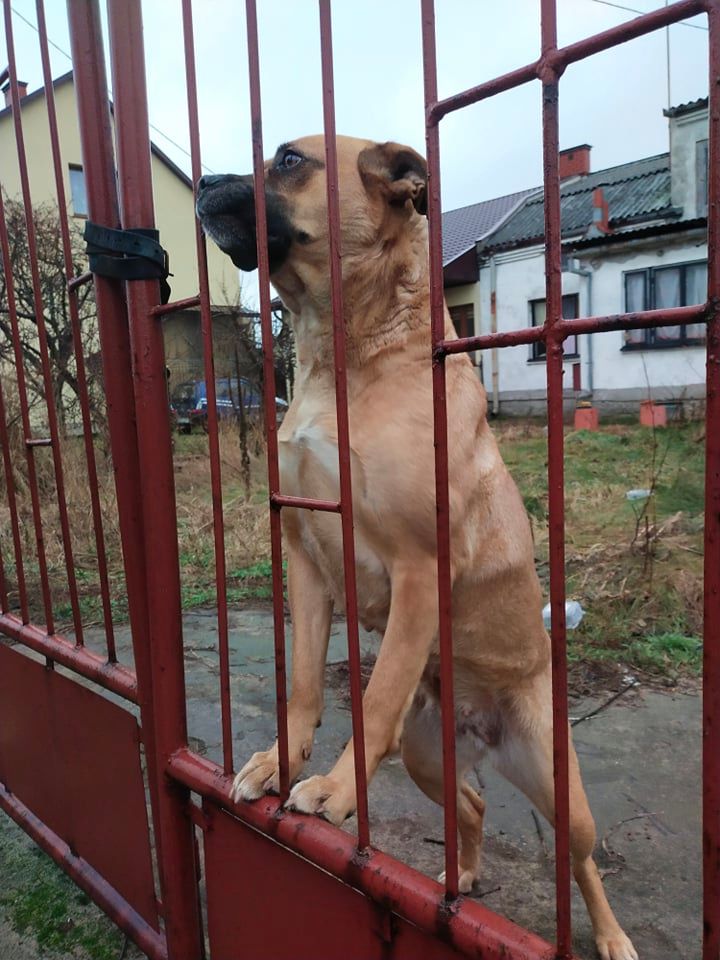Aza to młoda suczka w typie molosa. Mimo trudnego życia, ma bardzo przyjacielski charakter.