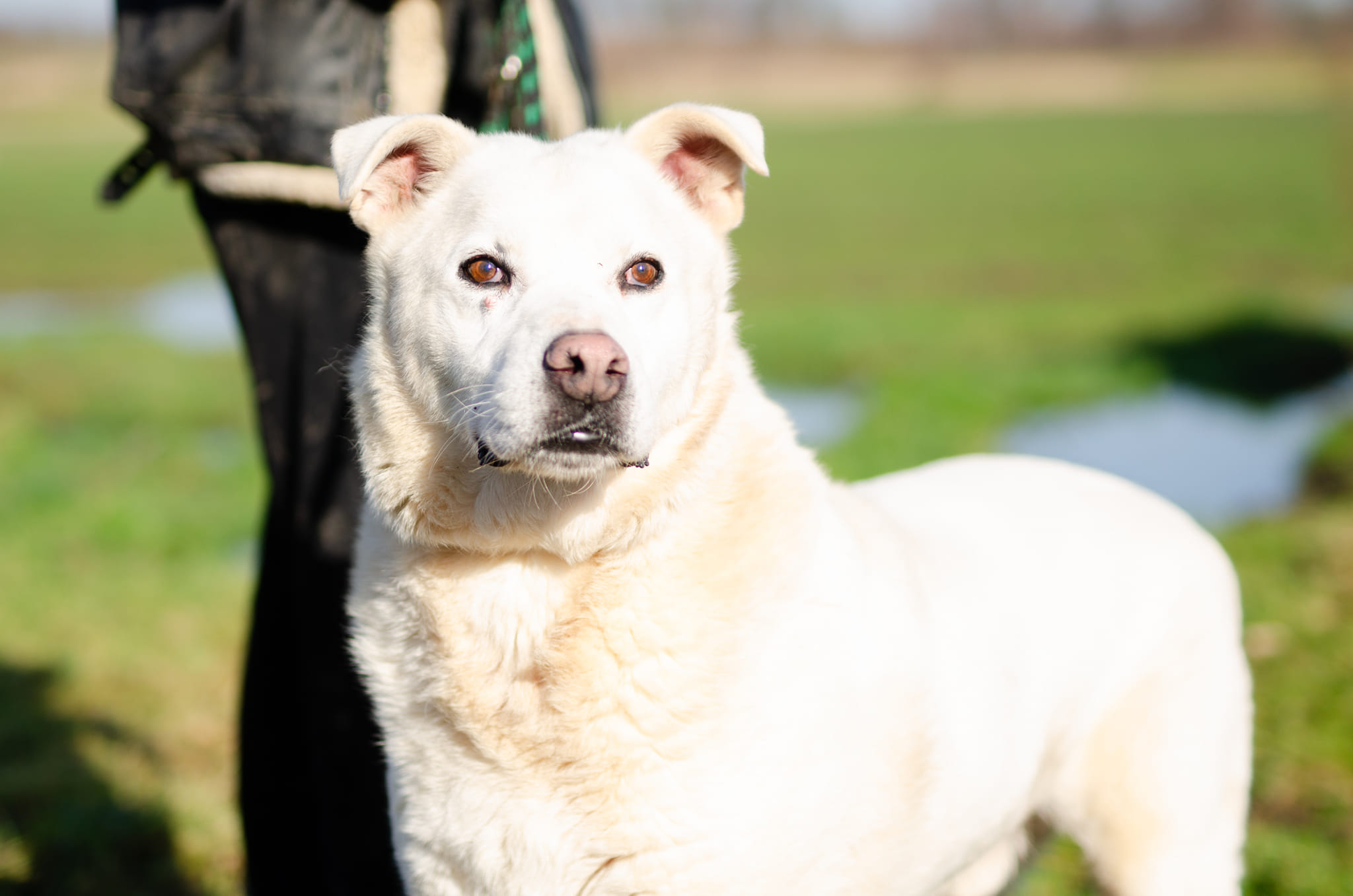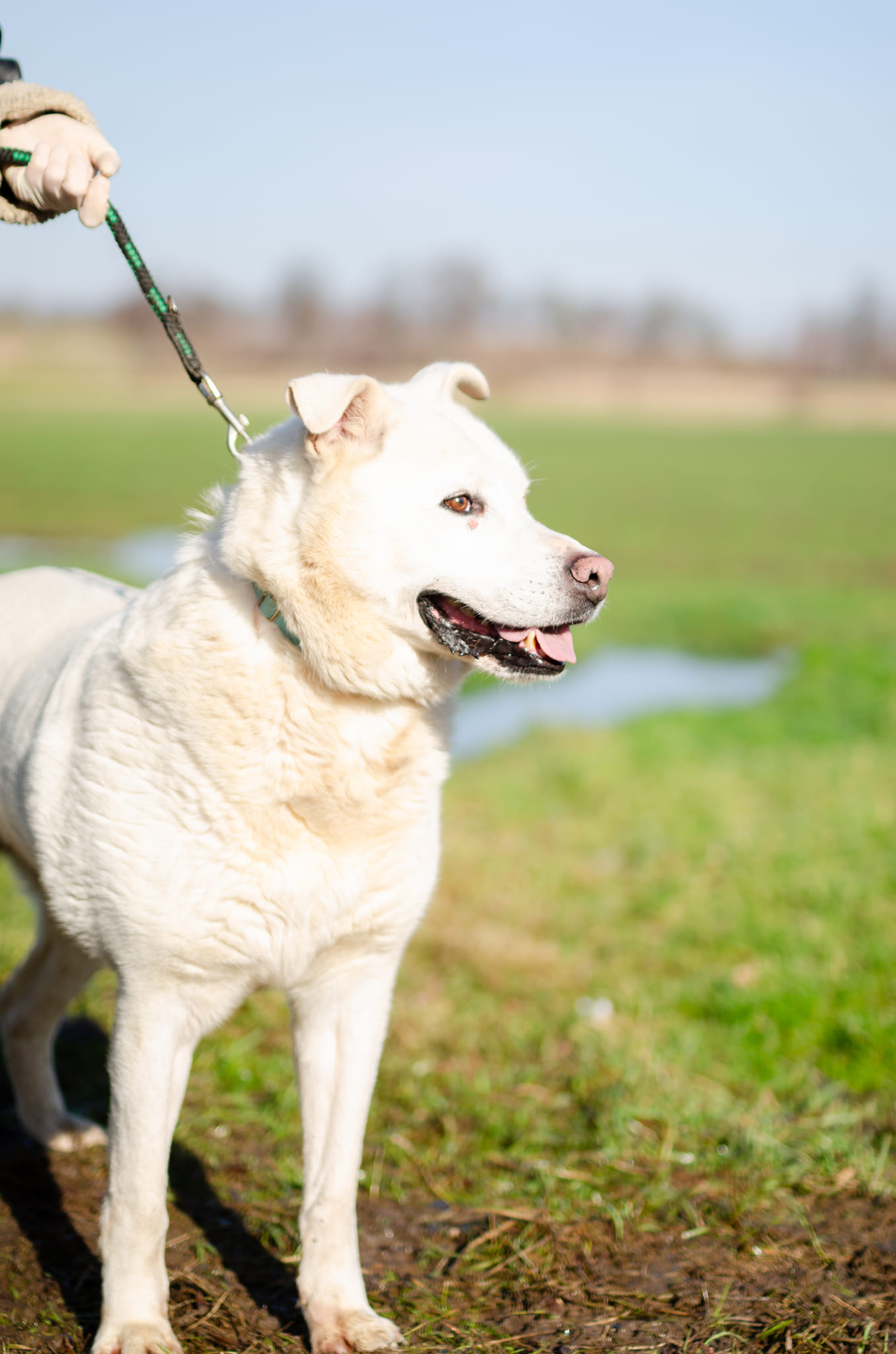 Biały jest nieskazitelnie pięknym psem naprawdę sporych rozmiarów.