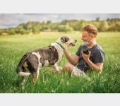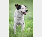 Psiak jest zakochany w człowieku, radzi sobie w kontakcie z innymi psami, nie sprawdziłyśmy stosunku do kotów.