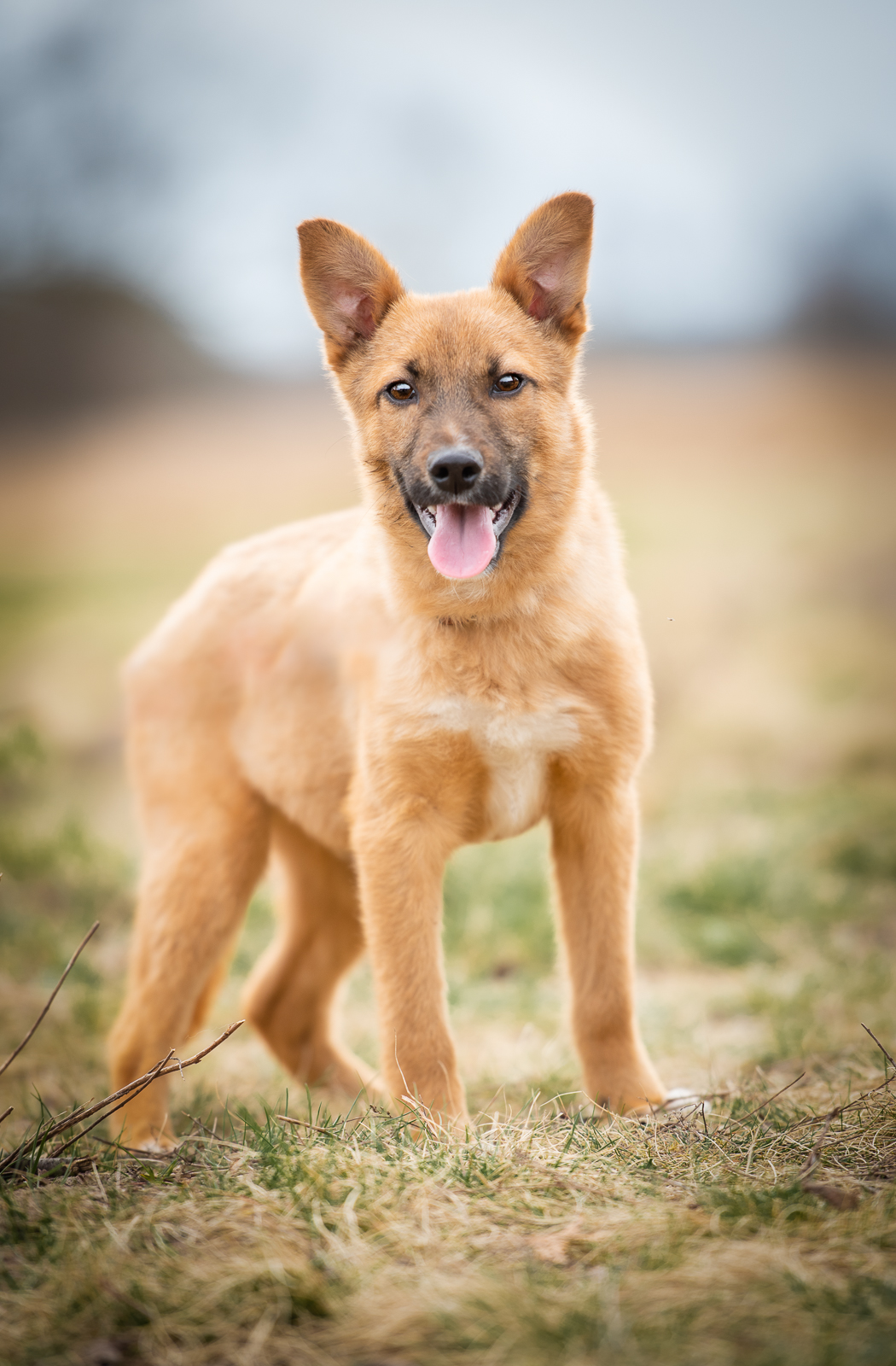 Ma około 6 miesięcy. Waży około 11 kg. Mieszka w kojcu z innymi psami, lubi ich towarzystwo.