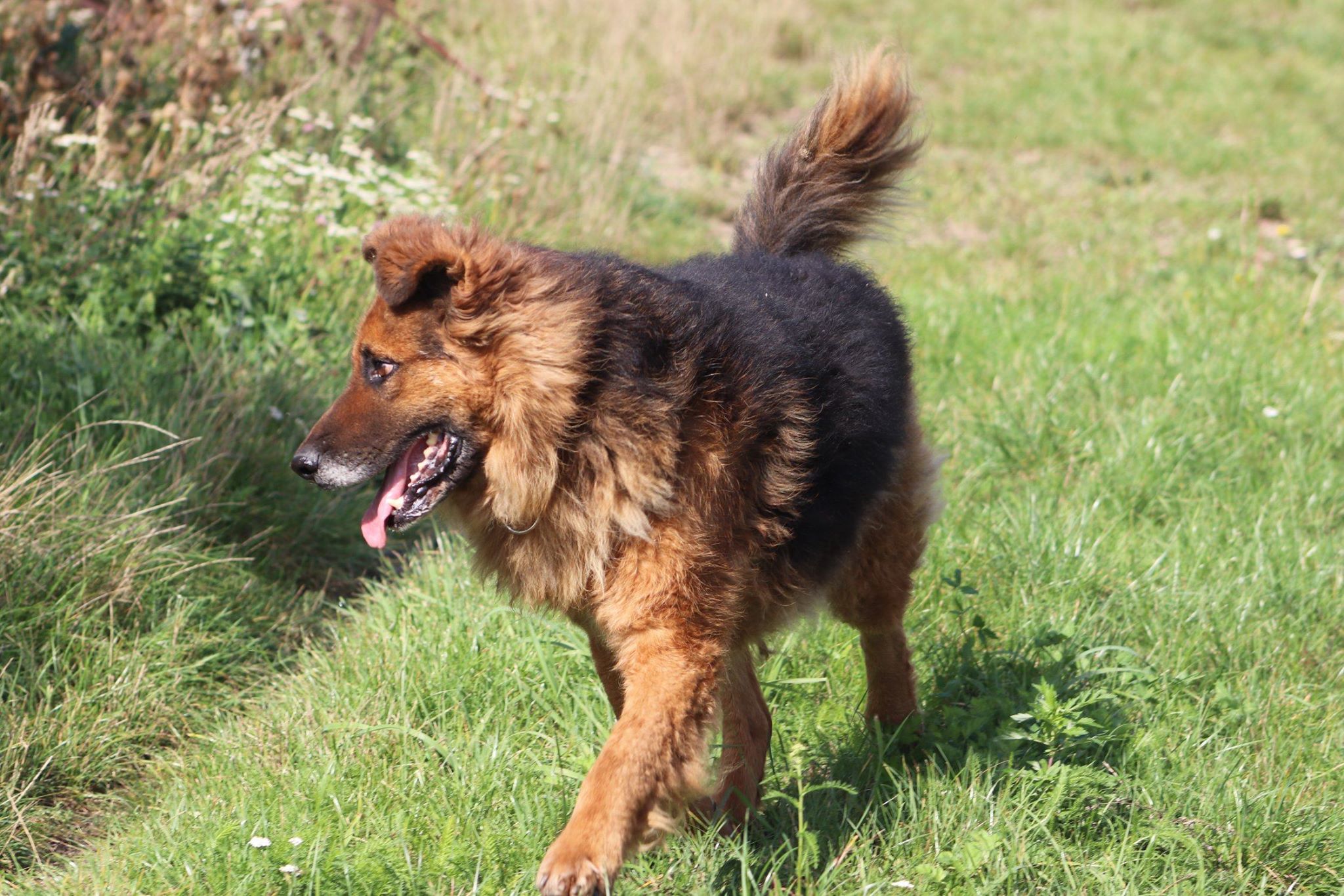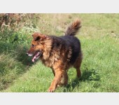 Hugo. Ok. 5/6 letni piękny, dostojny pies w typie owczarka. O niespotykanej falującej, brązowo-złoto-podpalanej sierści. Wpatrzony w człowieka, toleruje też inne psy.