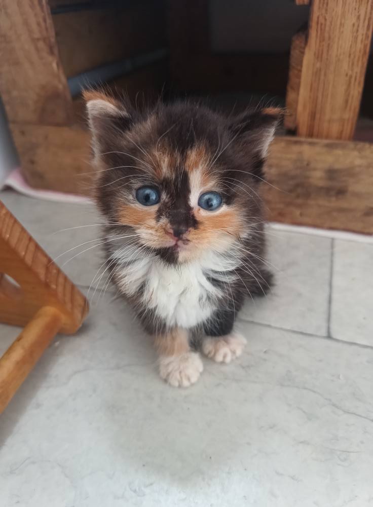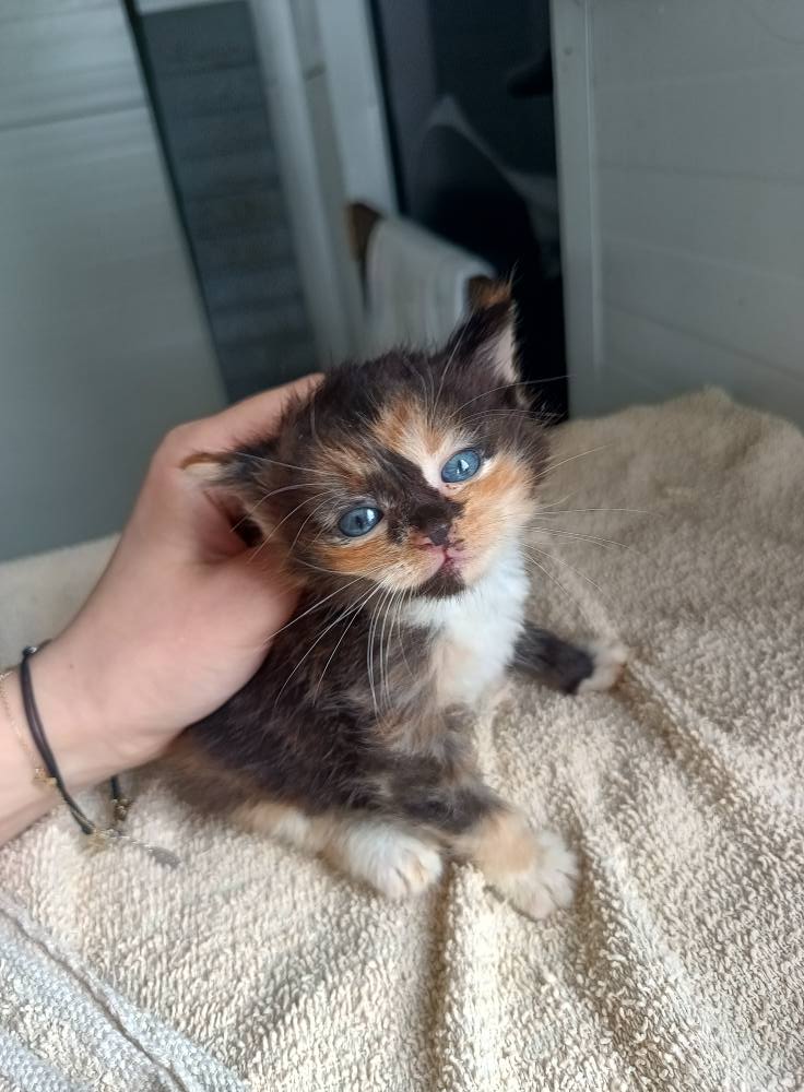 Maleństwo trafiło do naszego schroniska znalezione w lesie razem z rodzeństwem. Kociaki były czyściutkie, zadbane i bardzo proludzkie, to nie są dzikie dzieci natury.
