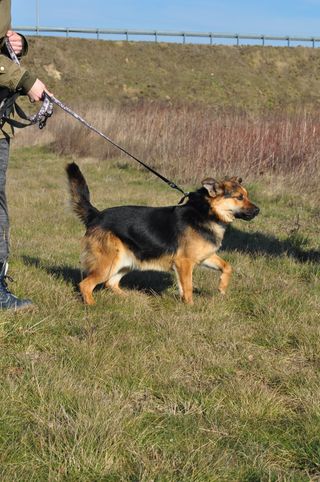 Umie chodzić na smyczy, początkowo trochę ciągnie.