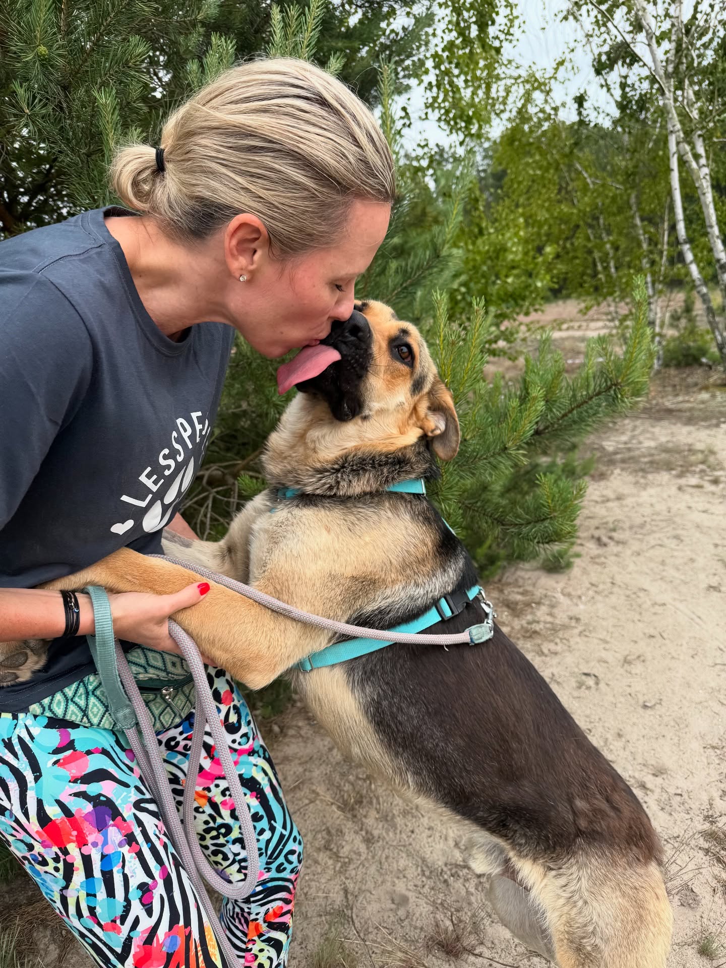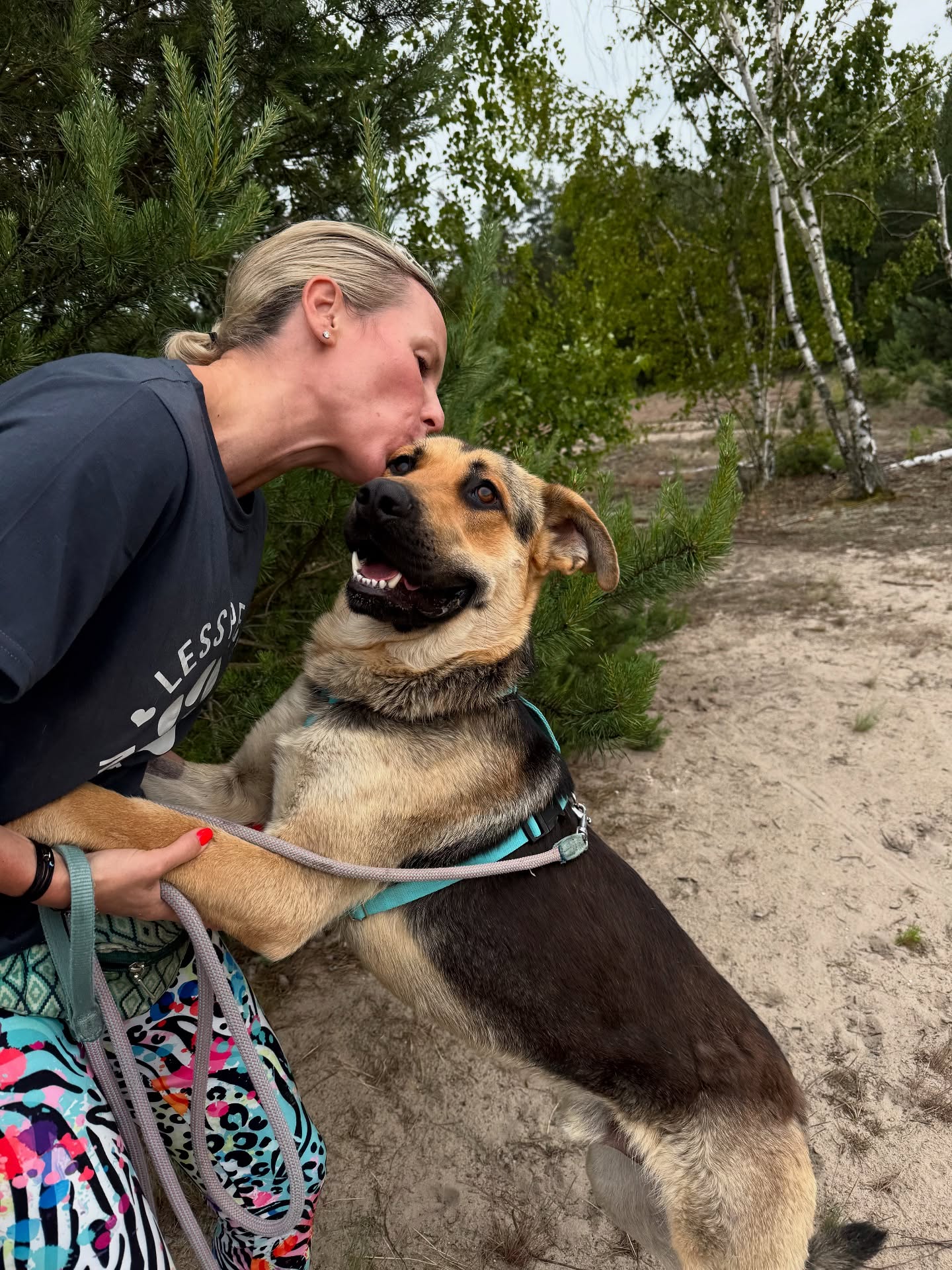 Już chodzi na spacerki na smyczy, pięknie reaguje na komendy.