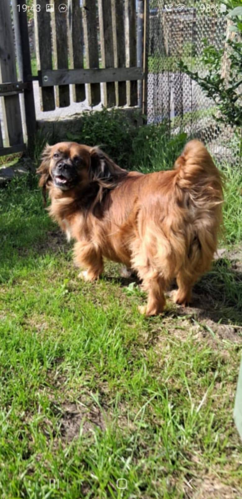 Piesek ma 6 lat, jest bardzo przyjazny i łagodny.
