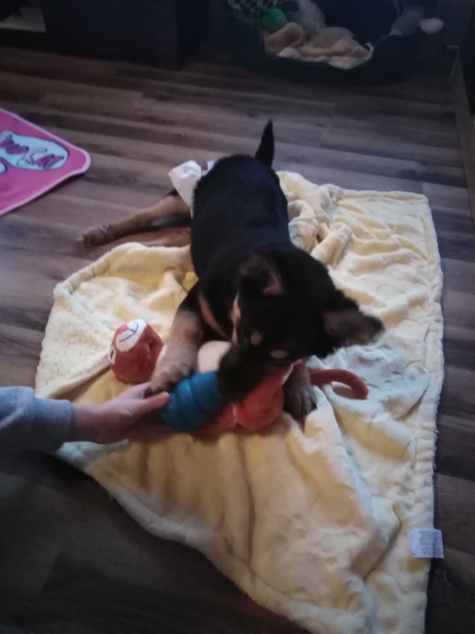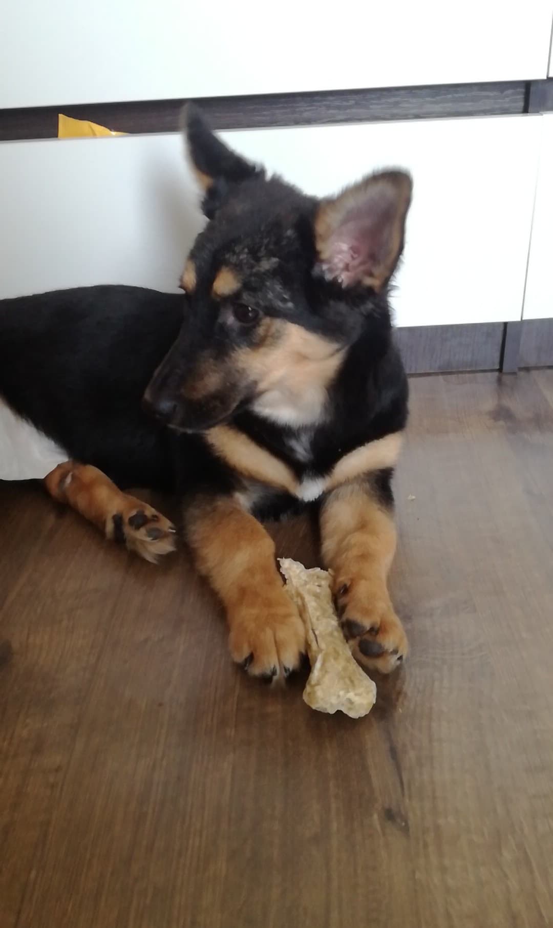 Matylda to 4-miesięczną sunią, którą zaopiekowaliśmy się 2 miesiące temu (przyjechała do nas ze zgłoszenia, znaleziona na drodze, prawdopodobnie po wypadku komunikacyjnym).