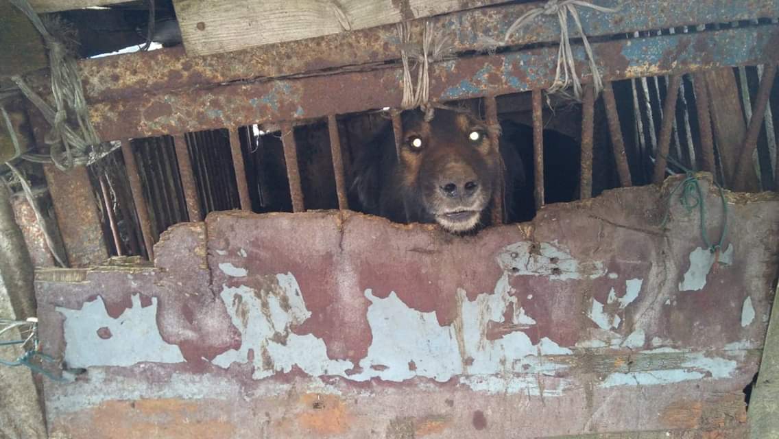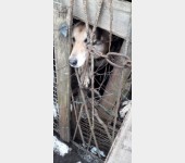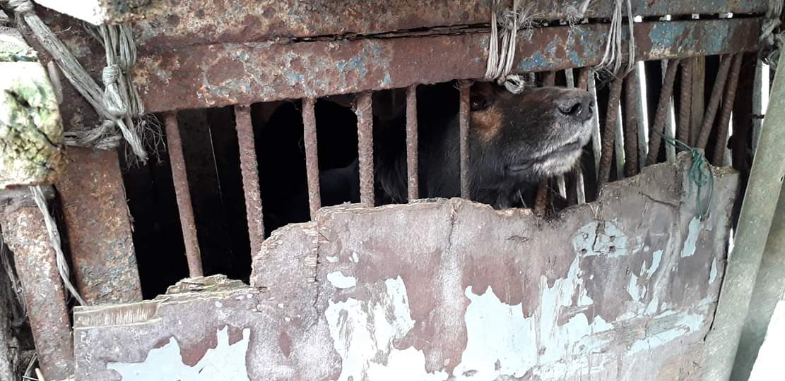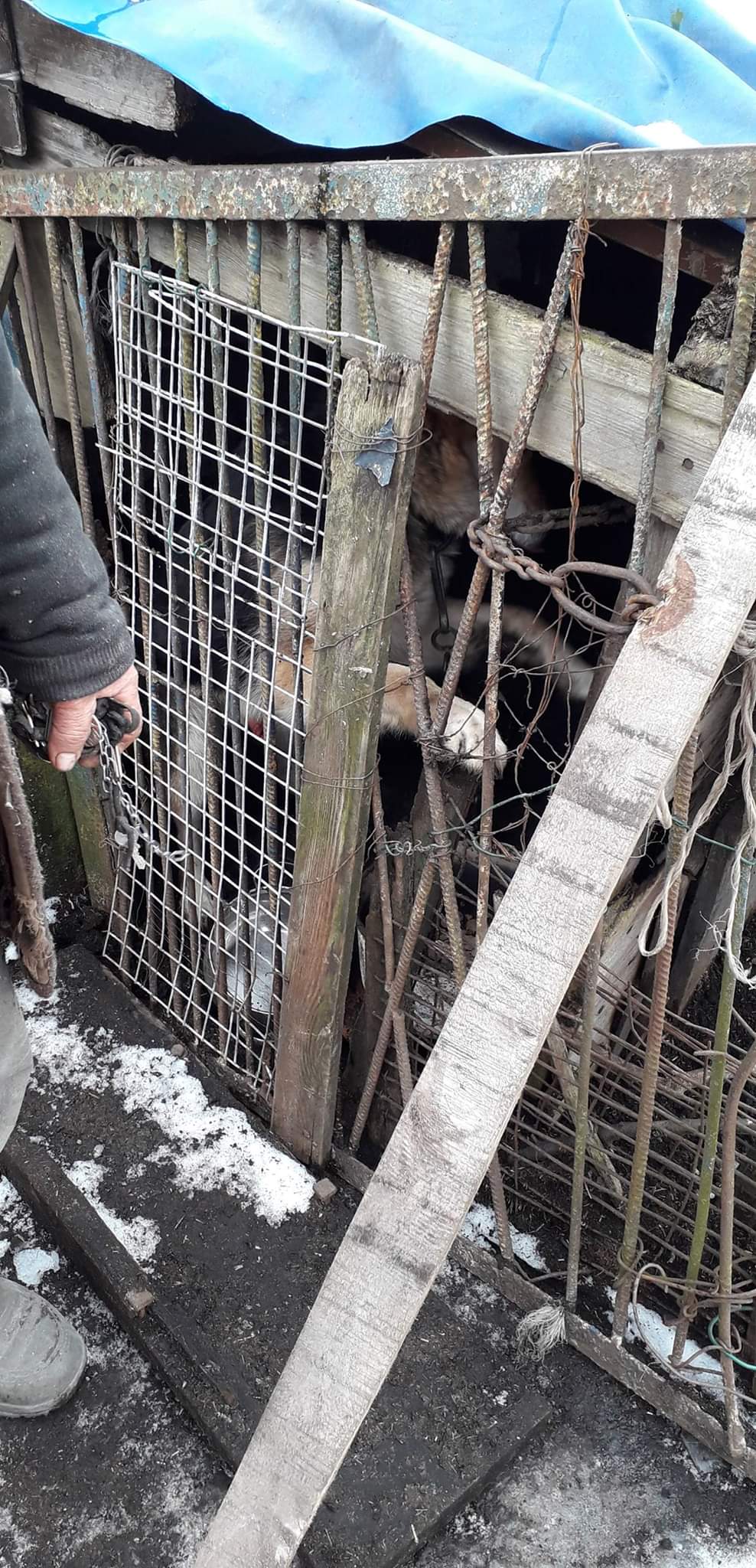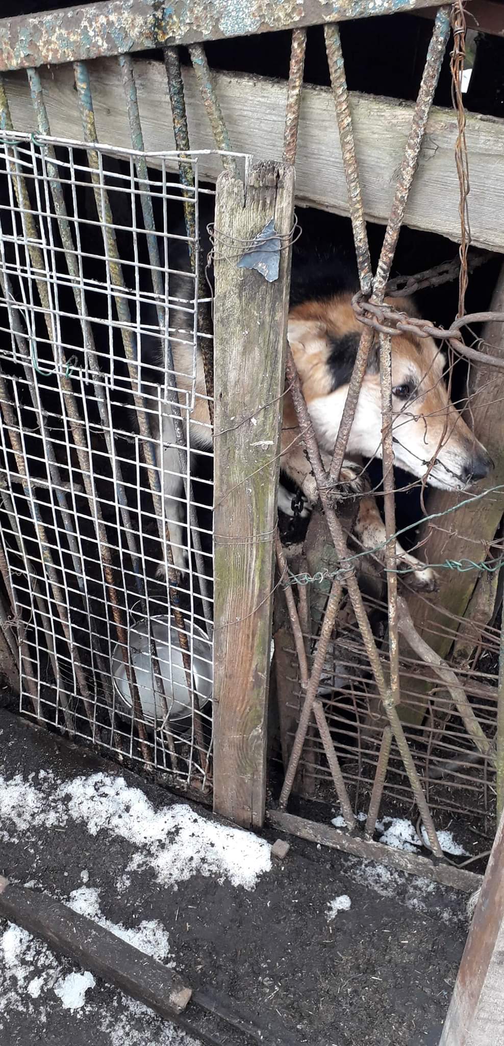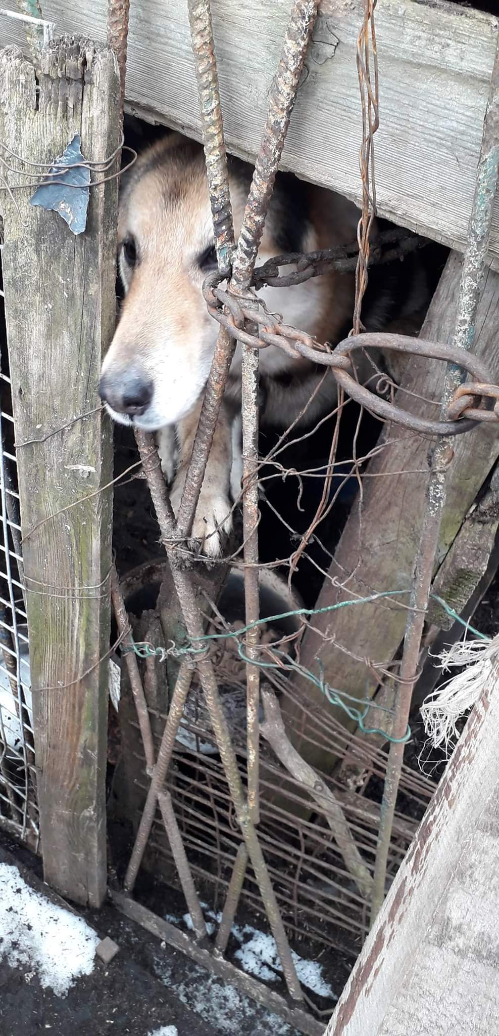 No i kolejny psiak... W "klatce", na łańcuchu, błoto i odchody... Klatka to tak naprawdę ściany z blach i krat, bez wyjścia...
