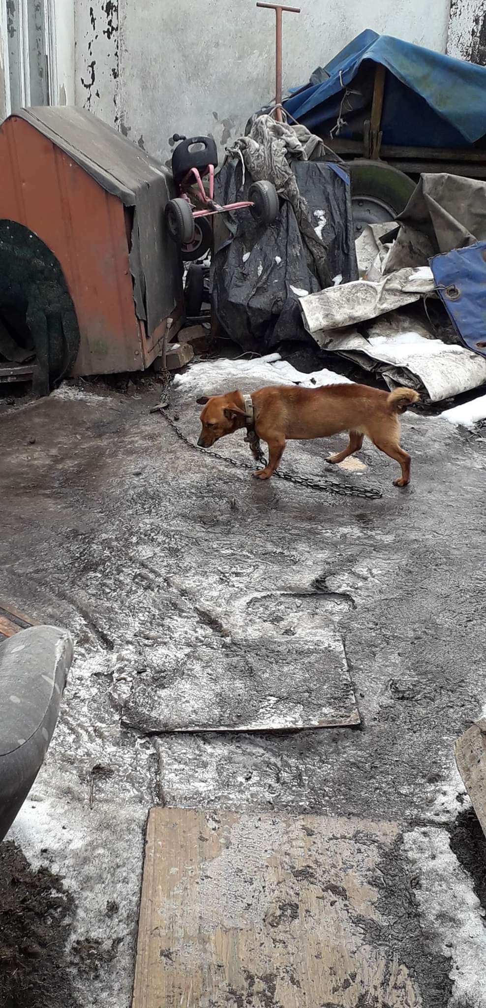 No i mamy... Rudy kundelek, na łańcuchu, z ogromną budą, w której nie ma niczego, co zapewniłoby mu odrobinę komfortu. Dalej kurnik, czyli coś z niczego, jakieś niby zadaszenie, ogólnie zlepek śmieci.