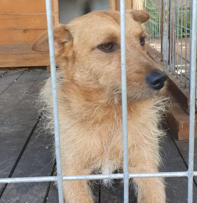 Psiak wyrywa się do człowieka. Mega przyjazny, liże przez kraty. Bardzo nieszczęśliwy w kojcu.