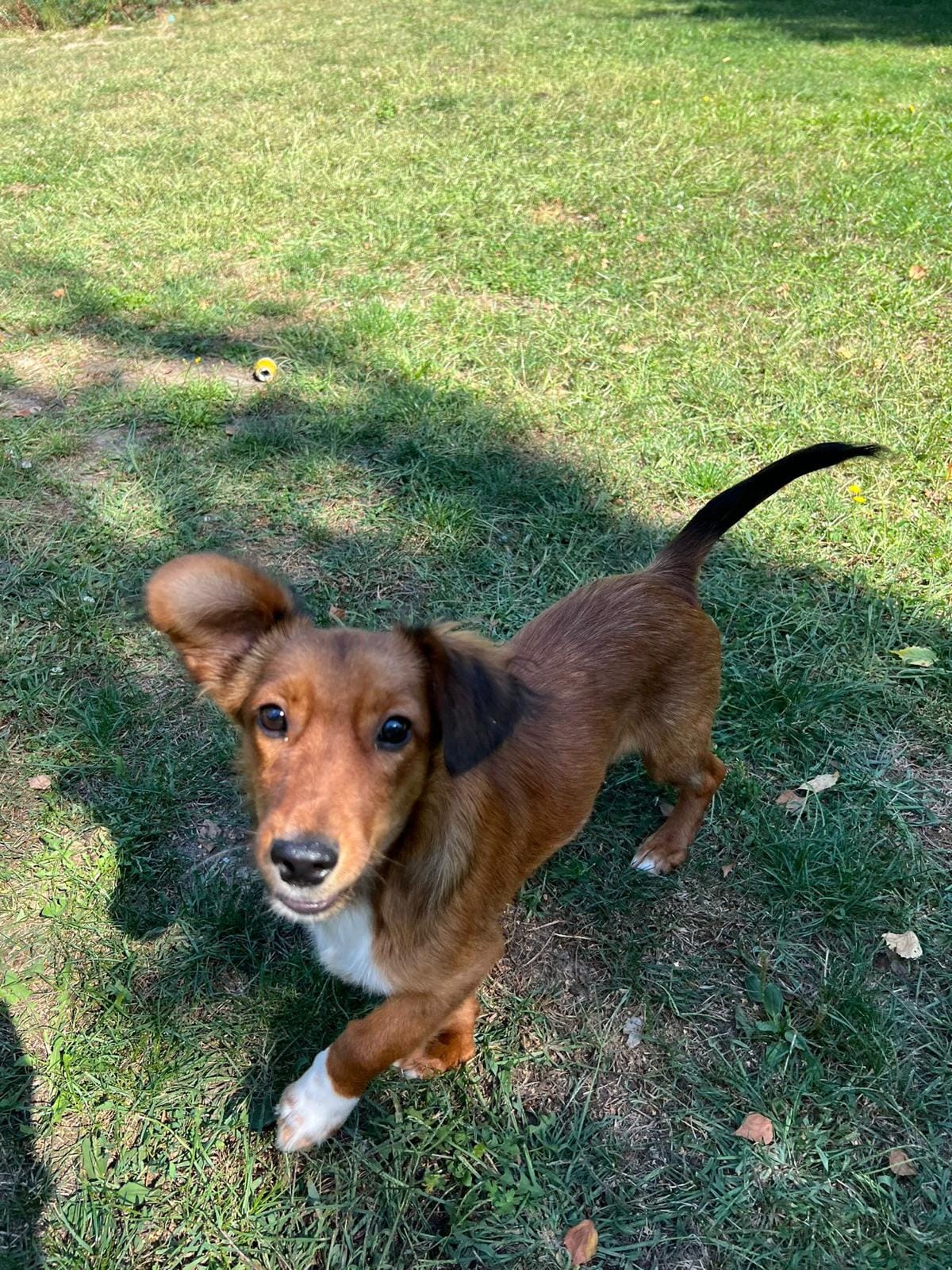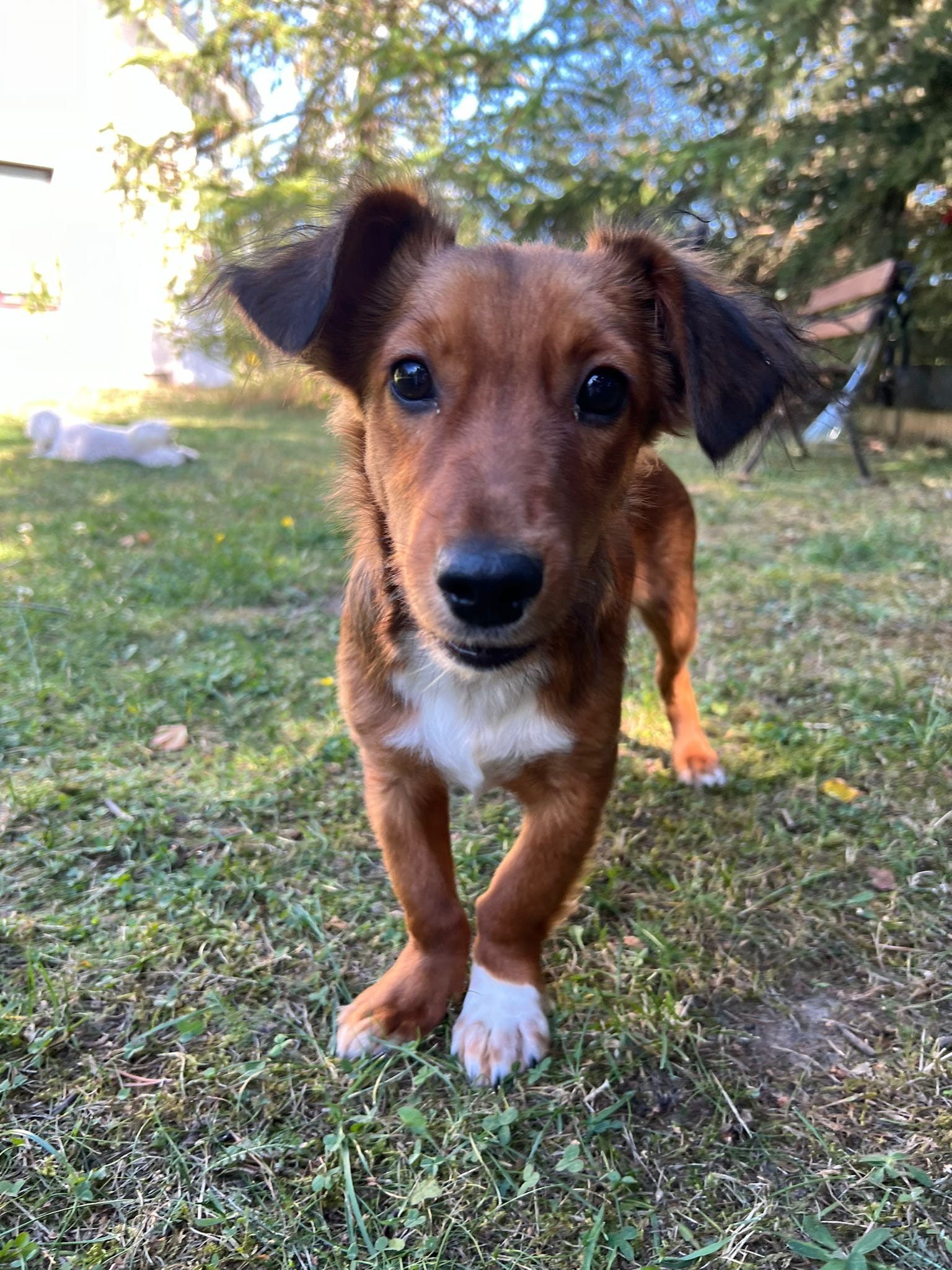 Piesek ma 5-5,5 miesiąca. Szybko się uczy, załatwia się tylko na maty.