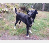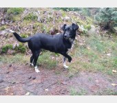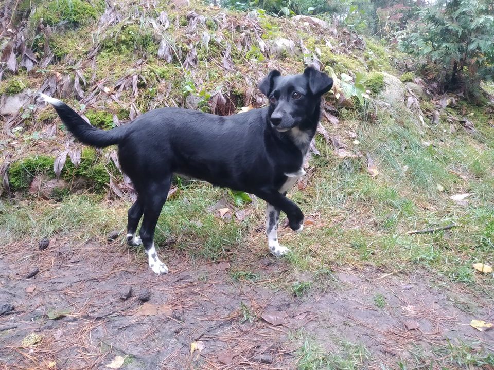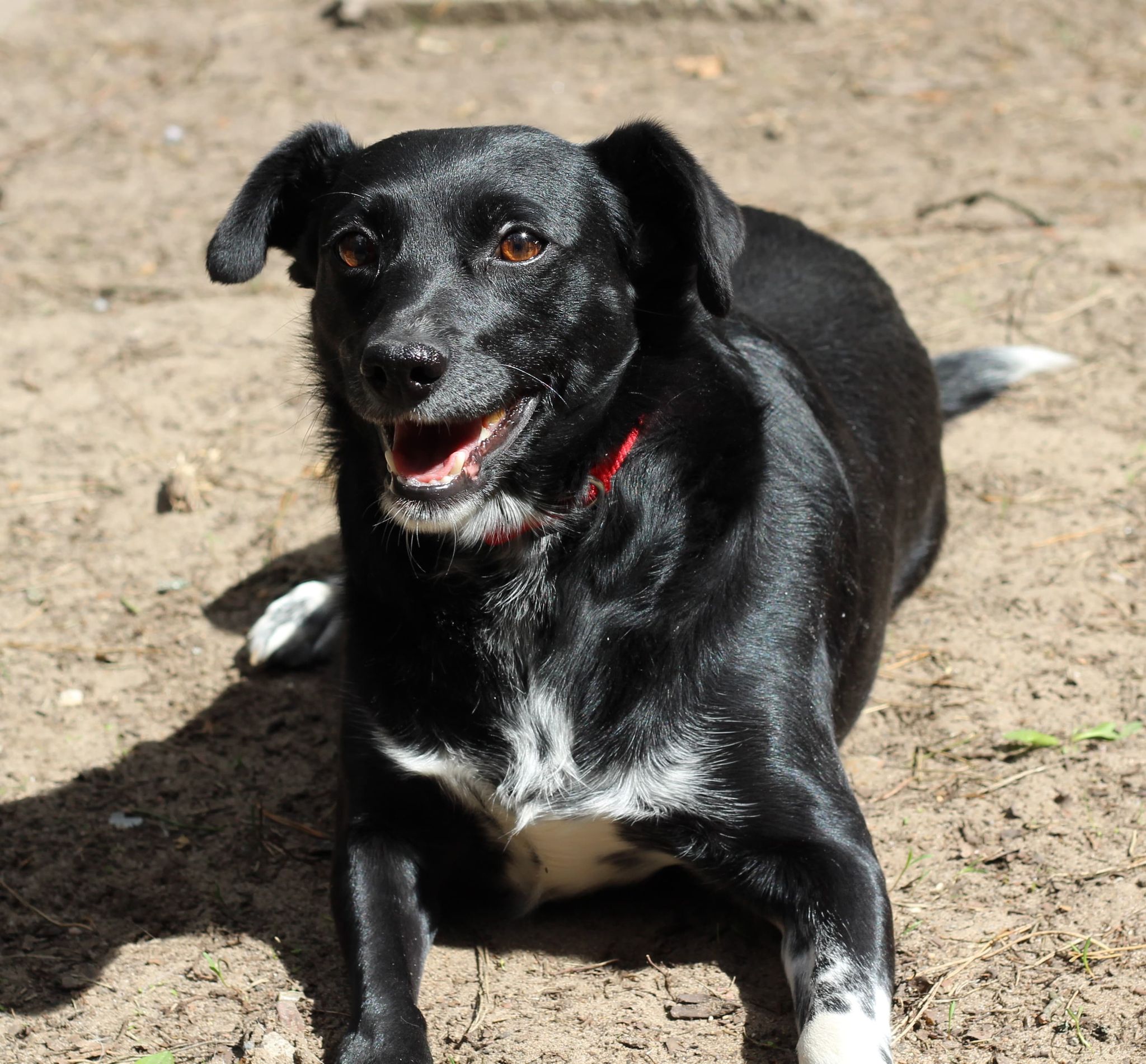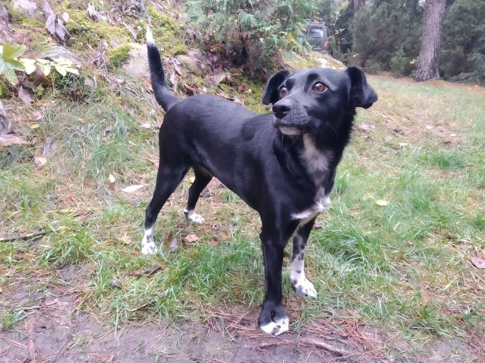 Malutka ma piękna czarną sierść, nakrapianą w białe kropki. Jest pogodną, przytulaśną sunią. Dogada się z każdym psem, niestety koty goni.
