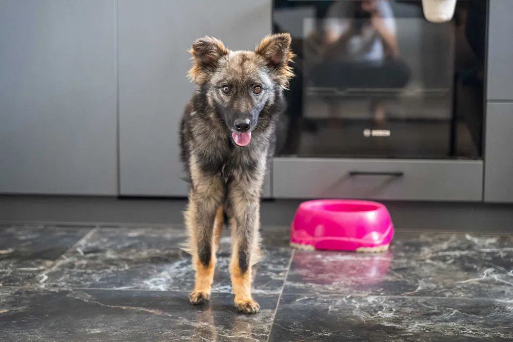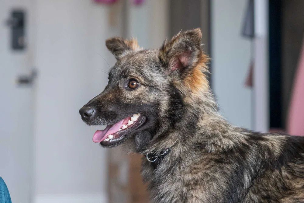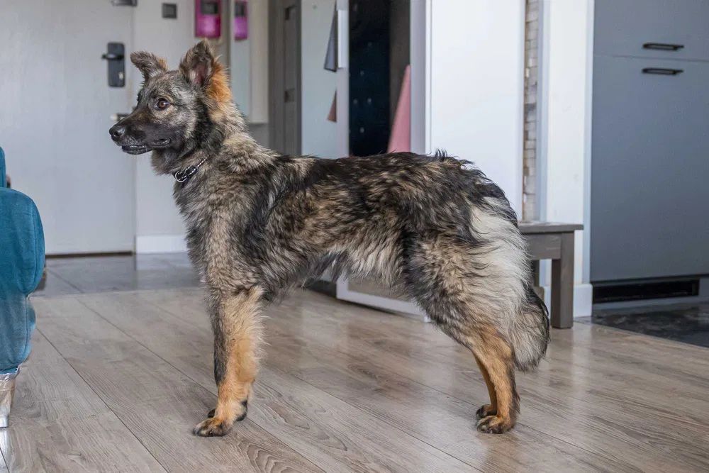 Pimpek ma około 1-1,5 roku i waży raptem 8 kilo. Jest puchaty i sarenkowaty, sięga do połowy łydki.