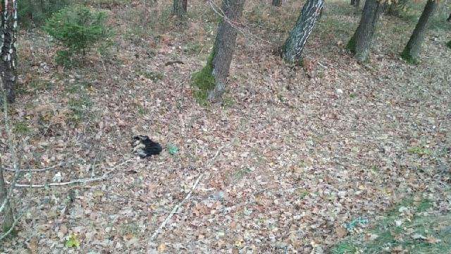 Zgłoszenie z dzisiejszego rana (1 listopada) od osób, które wybrały się na grzyby. W rowie w lesie, za Bierdzanami w kierunku Olesna, leży pies. Żyje, ale nie rusza się.