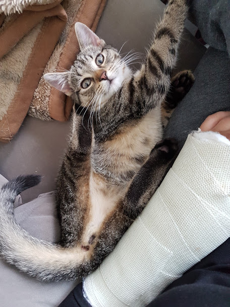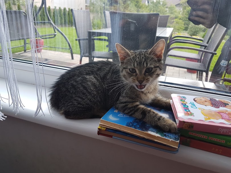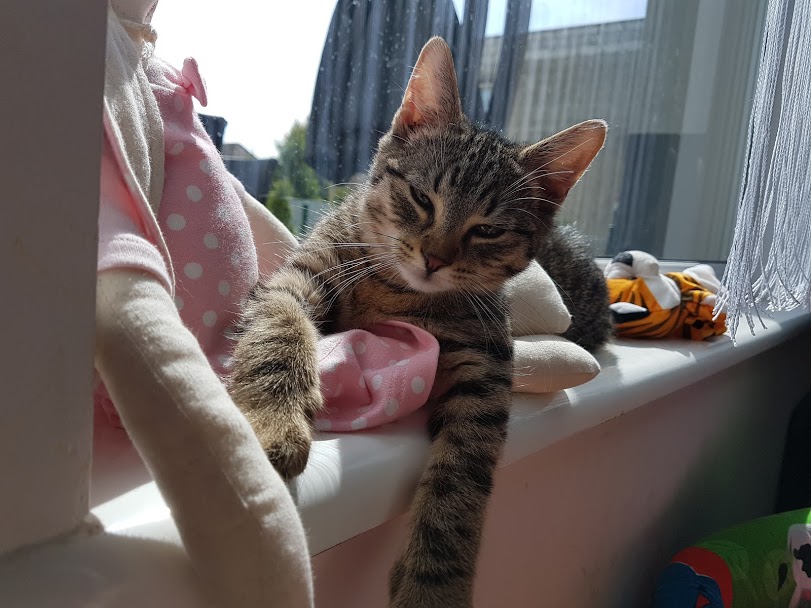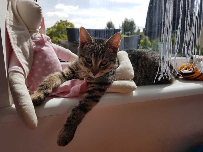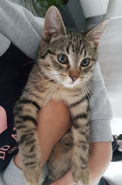 Poziomka musiała mieć wcześniej kontakt z ludźmi: jak tylko została zabrana na ręce traktorek głośno poszedł w ruch. Malutka przez pierwsze dni w klatce głośno płakała, tak bardzo nie chciała być sama. Teraz już zaakceptowała sytuację i cichutko, pełna nadziei czeka na dyżury wolontariuszek, które są najważniejszym momentem jej dnia dnia. Ukochane zabawki to wszelkiego rodzaju myszki i piłeczki. Koteczka uwielbia się przytulać oraz być głaskana, rozpływa się wtedy ze szczęścia. Bardzo lubi dawać buziaki okazując Ciociom swoją miłość. Tygrysek szuka kochającego domu z innymi młodymi kotami chętnymi do wspólnych zabaw.