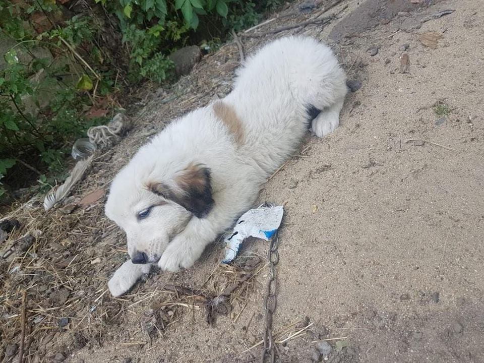 Psie dziecko na łańcuchu.