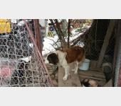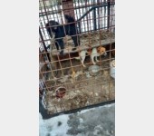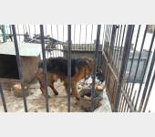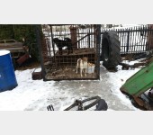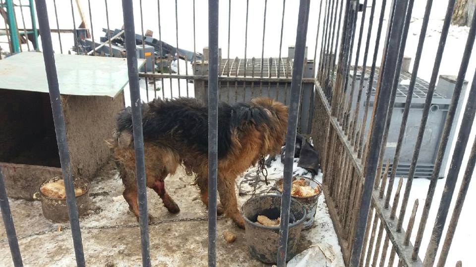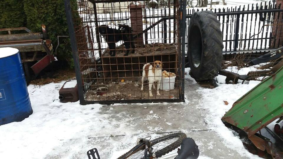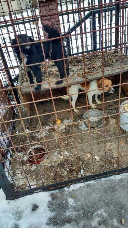 W kolejnym, bardzo niedużym kojcu, a raczej klatce, znajdowały się dwa średniej wielkości psy, bez budy. Plastikowe wiadro było po brzegi wypełnione rozmoczonym, zmarzniętym na kamień chlebem. Cała powierzchnia kojca była pokryta grubą warstwą, od dawna niesprzątanych odchodów.