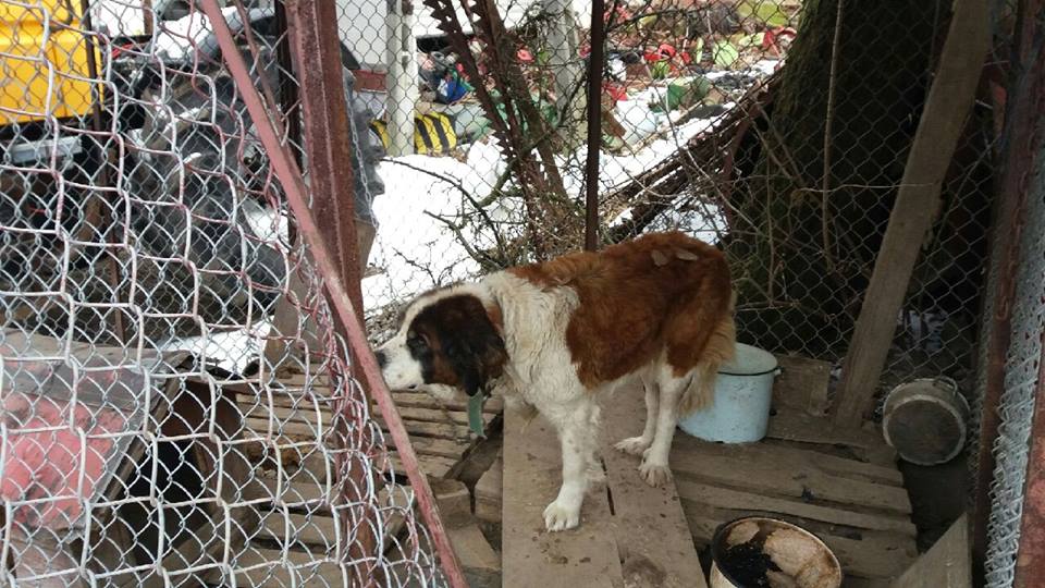 Na terenie posesji pośród porozstawianych maszyn rolniczych znajdowały się kojce z psami. W Jednym z nich znajdował się pies w typie bernardyna. Kojec był cały zagracony, poprzewracane deski, garnki, panował ogólny bród i widać było, że jest dawno nie czyszczony z odchodów psich. W kojcu znajdowała się nieocieplona buda, jednak była ona zbyt mała, aby wszedł do niej tak duży pies. W garnkach znajdował się zamarznięty chleb rozmoczony w wodzie.