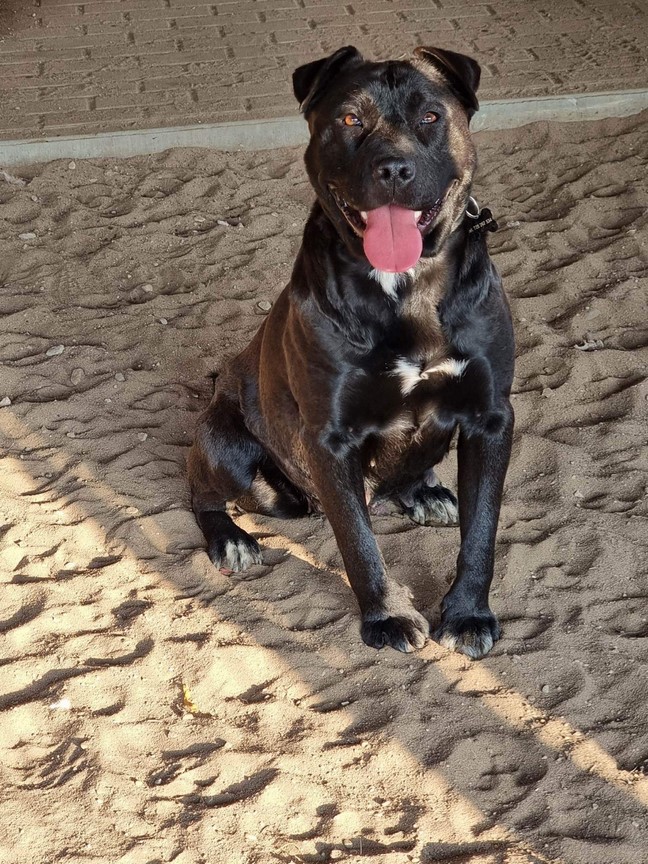Suczka ma około 2 lat, jest dużym, masywnym psem w typie pitbulla - waży 28kg.