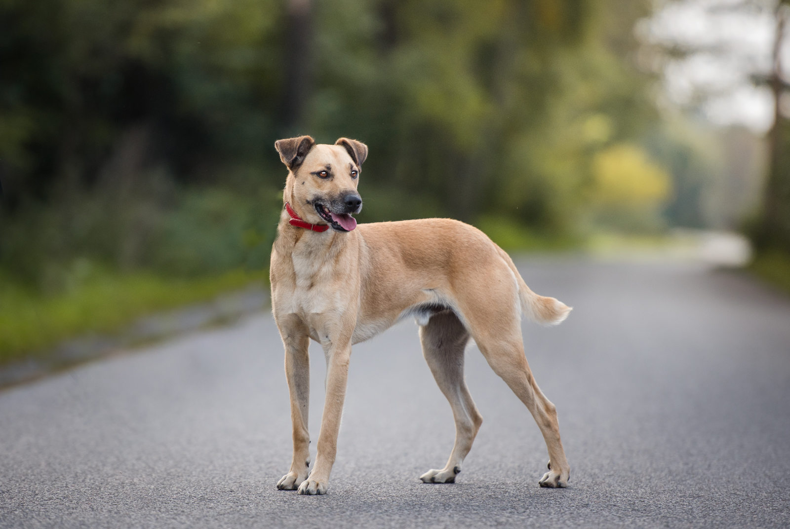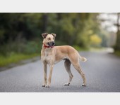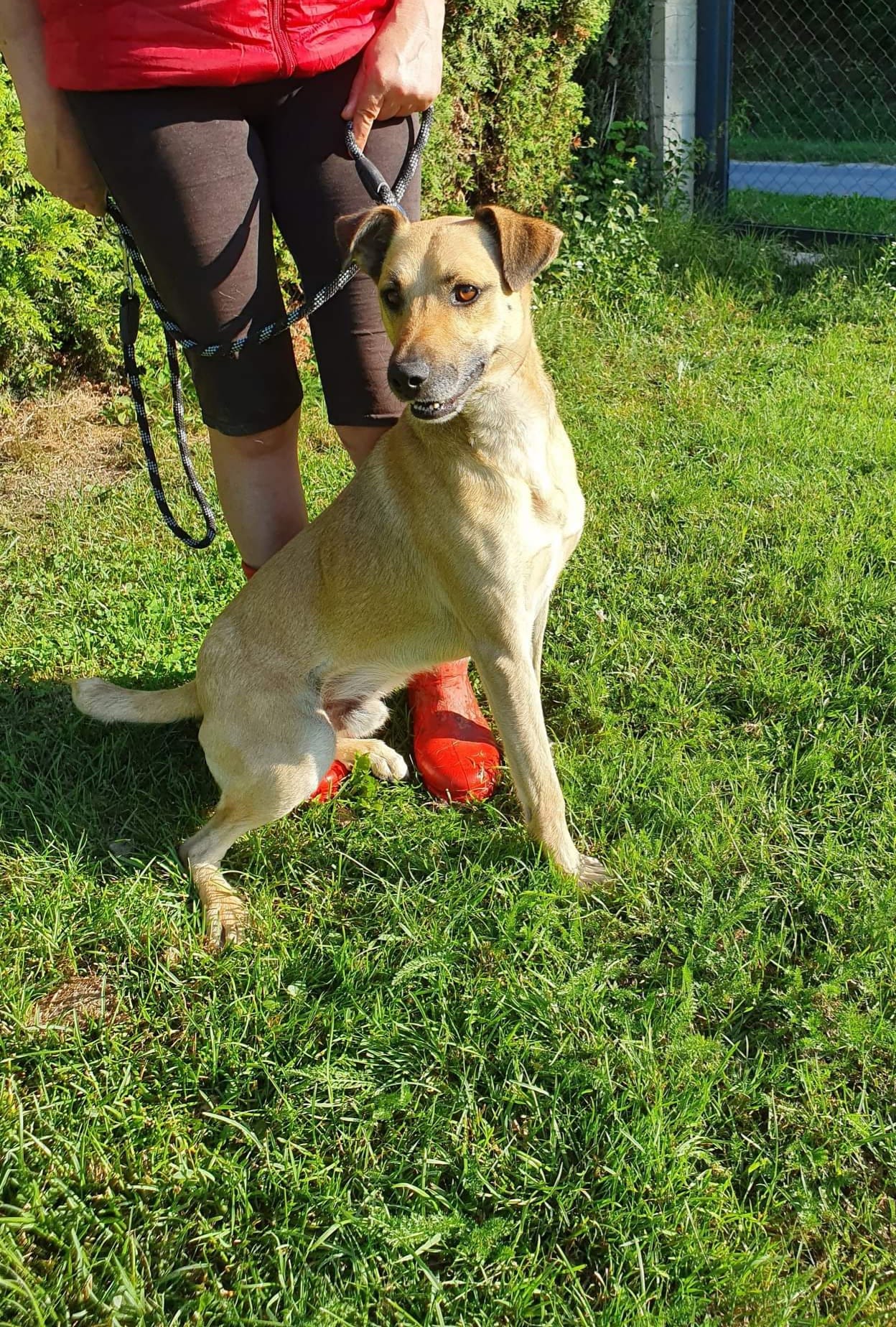 To młody, około 2 letni psiak średniego wzrostu, między 15 a 20 kg wagi, sięga do kolana.
