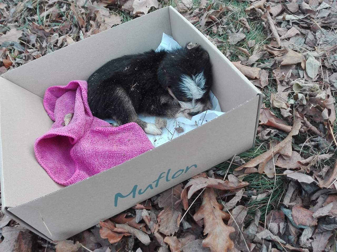 Ktoś zostawił szczeniaka w kartonie za placem zabaw na ulicy Dojazdowej w miejscowości Kobyłki.
