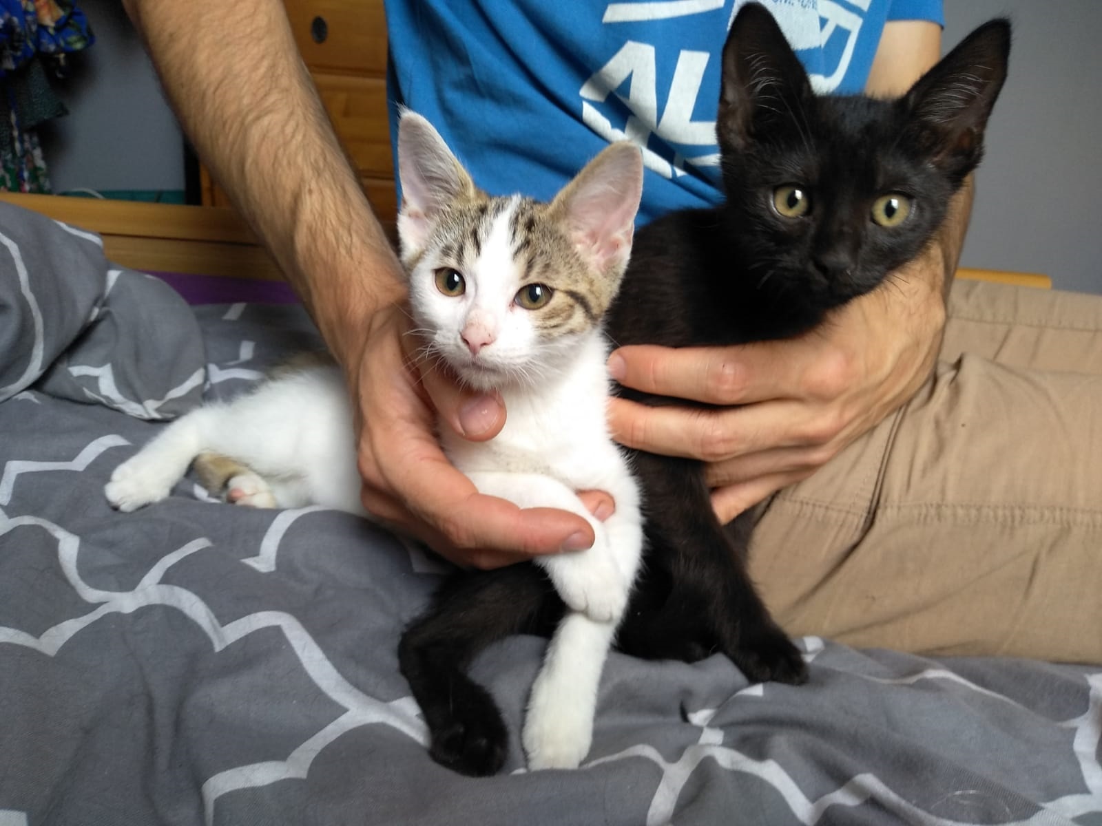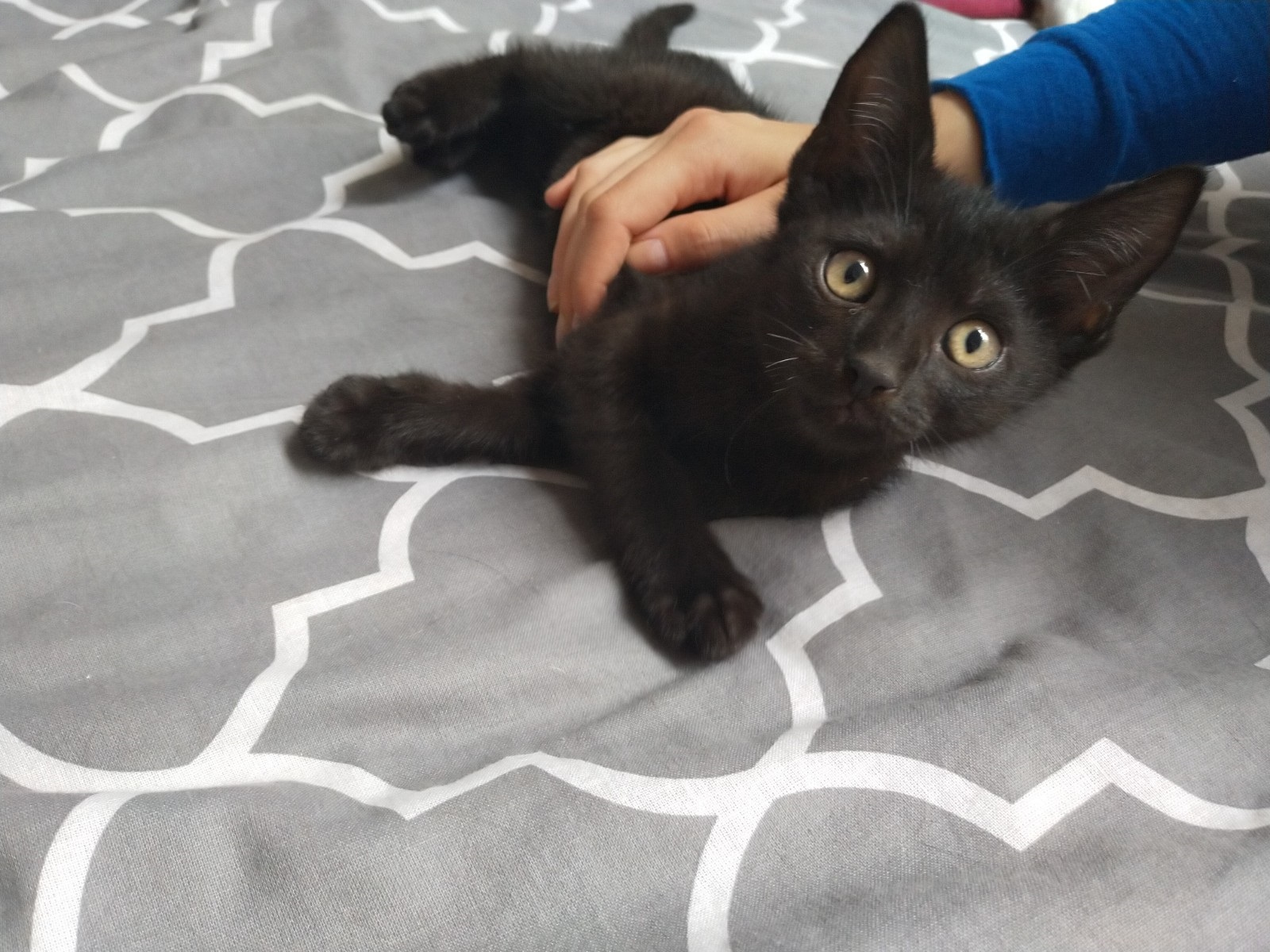 Teraz podrósł (ma już 10 tygodni), biega, skacze, dokazuje, dobrze dogaduje się z kotami oraz psami. Codziennie szaleje na drapaku lub biega z siostrą Topcią.