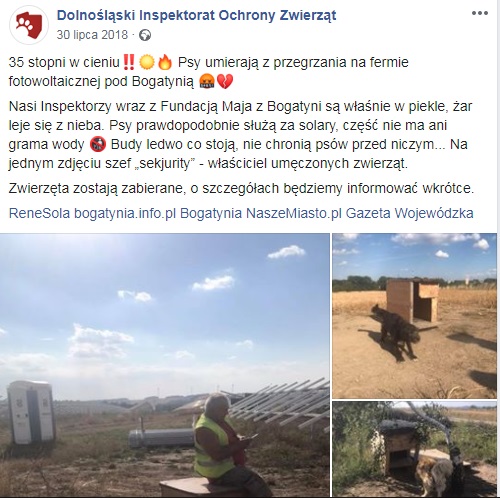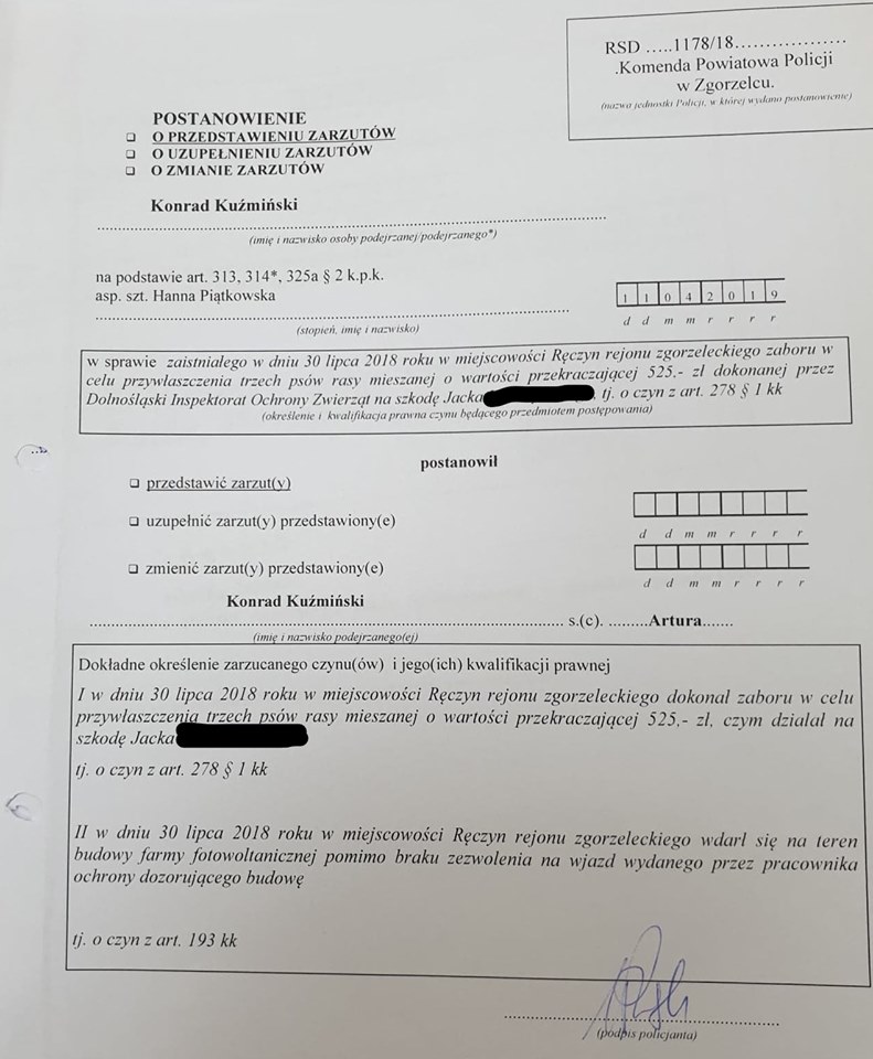 "Powodem zatrzymania miał być fakt, że nie stawiłem się na komendę do Zgorzelca w celu złożenia zeznań w charakterze podejrzanego o popełnienie dwóch przestępstwa – kradzieży 3 umierających na oczach oprawcy psów oraz naruszenia miru domowego farmy fotowoltaicznej. Potwierdzam, że w lipcu 2018 r. w środku lata, przy 35 stopniowym upale w cieniu i występującym zagrożeniu meteorologicznym co do bardzo wysokich temperatur, przy asyście dwóch funkcjonariuszy policji odebrałem 6 przywiązanych łańcuchami do bud psów, którym właściciel nie zapewnił dostępu do wody, pożywienia i należytej ochrony przed upałami.