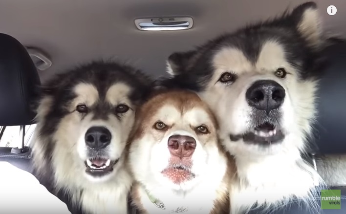W poniższym filmie psy wybierają się na przejażdżkę samochodową ze swoim opiekunem. Gdy mężczyzna włącza swoją ulubioną piosenkę, trzy alaskan malamute, które siedzą na tylnym siedzeniu, zaczynają śpiewać.