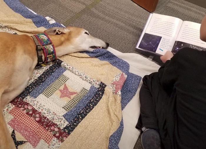 Ten pies jest certyfikowanym terapeutom. W ciągu dnia przebywał często ze swoim opiekunem w miejskiej bibliotece, gdzie odbywały się zajęcia uczące dzieci w wieku od 4 do 8 lat czytać na głos.