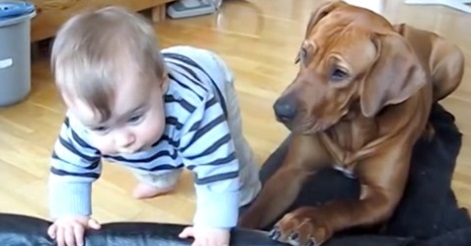 Zazdrość to naturalne uczucie. Ale zamiast być zazdrosnym, ten pies bardzo chętnie przyjmuje dziecko do swojego gniazdka.