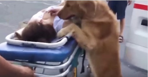 Kiedy ratownicy zanosili kobietę na noszach do karetki, pies szedł obok, a potem jechał z nią w ambulansie.