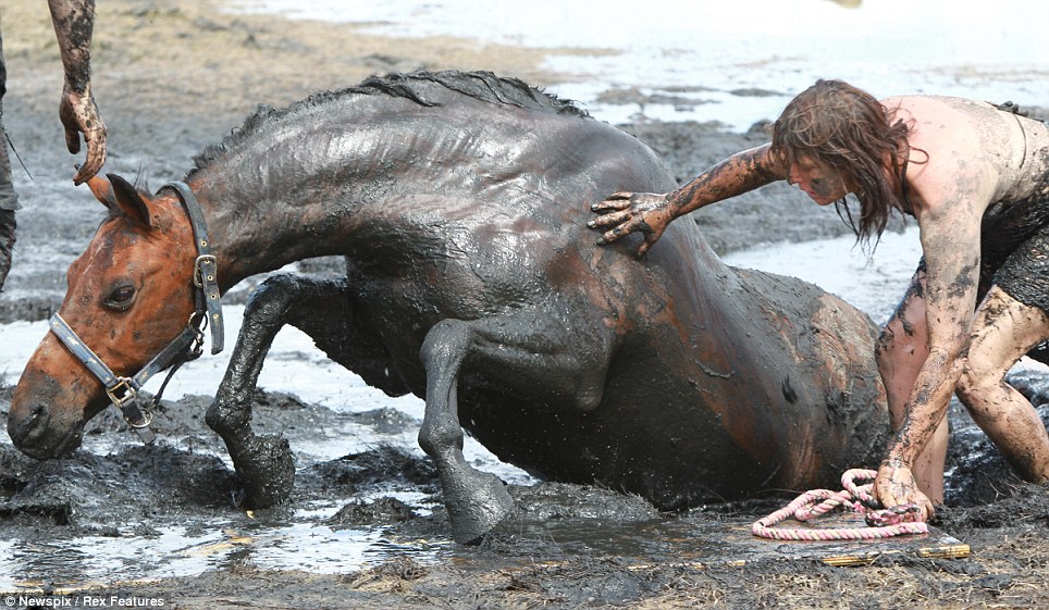 To był przerażający moment, w którym młoda kobieta walczyła, aby utrzymać konia w spokoju, kiedy utknął on w błocie.