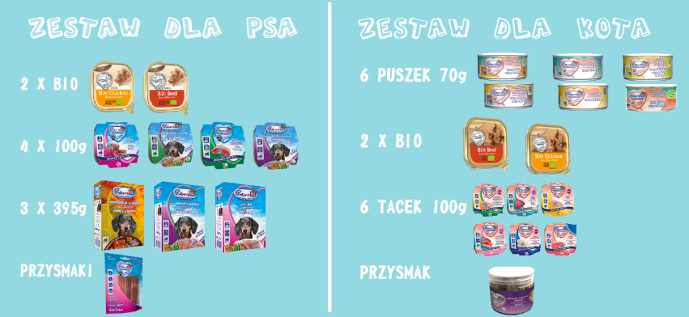 6. Nagrodami w konkursie są 4 zestawy dla psa lub dla kota.