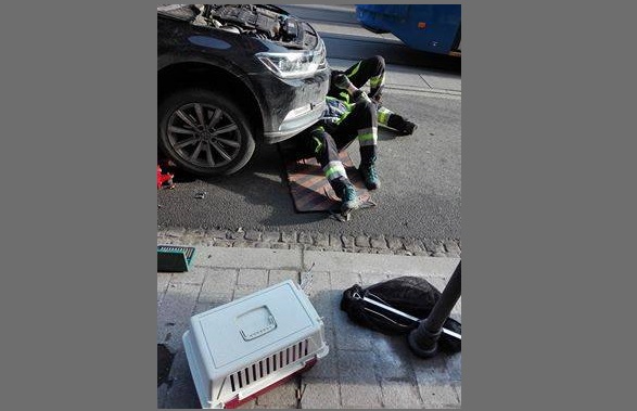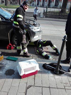 Po kilku minutach pojawili sie również Inspektorzy KTOZ. Spod maski samochodu wydobywało się miauczenie kotka jednak w żaden sposób nie można było go nakłonić do wyjścia.