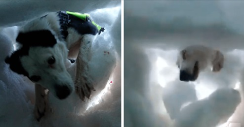 Nie minęło dużo czasu, zanim pies ratownik przedarł się przez pokrywę śniegu, by dotrzeć do potrzebujacego pomocy człowieka